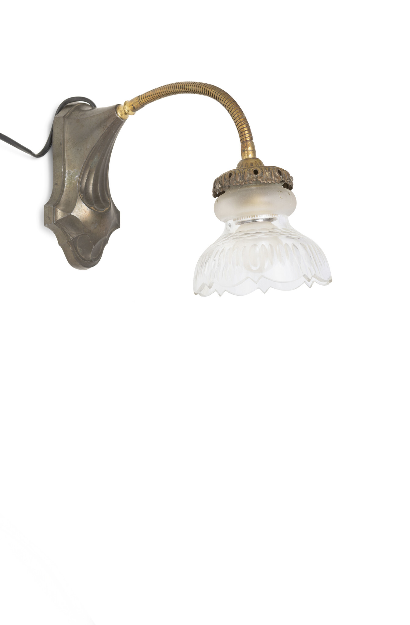 A brown and golden brown brass fixture with an elegant glass lampshade.