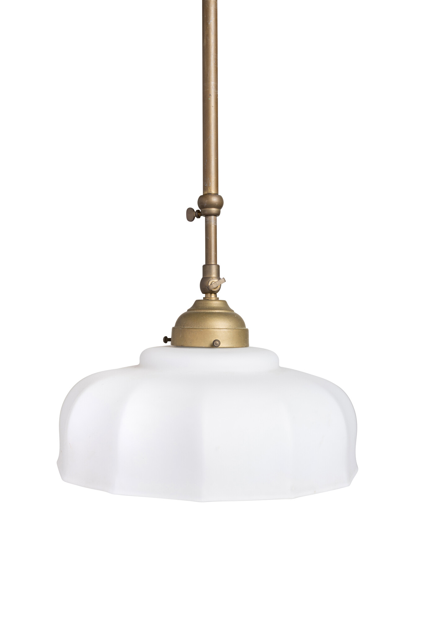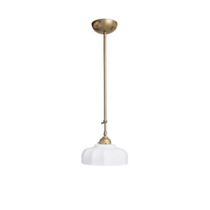 This beautiful vintage sliding pendant light exudes the charm of yesteryear, with its warm brass suspension and elegantly shaped white glass shade.