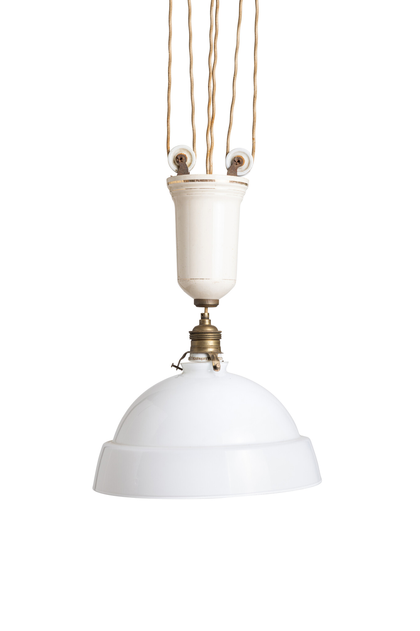 Old pendant lamp, a white glass shade on a white porcelain pull cord.