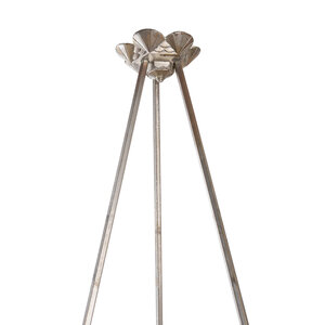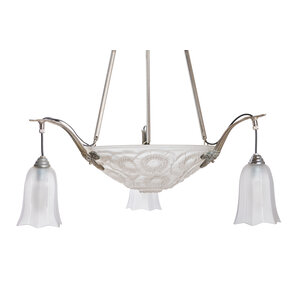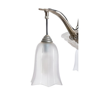 The bowl hangs on 3 square rods. And is also equipped with 3 arms with beautiful frosted glass lampshades.
