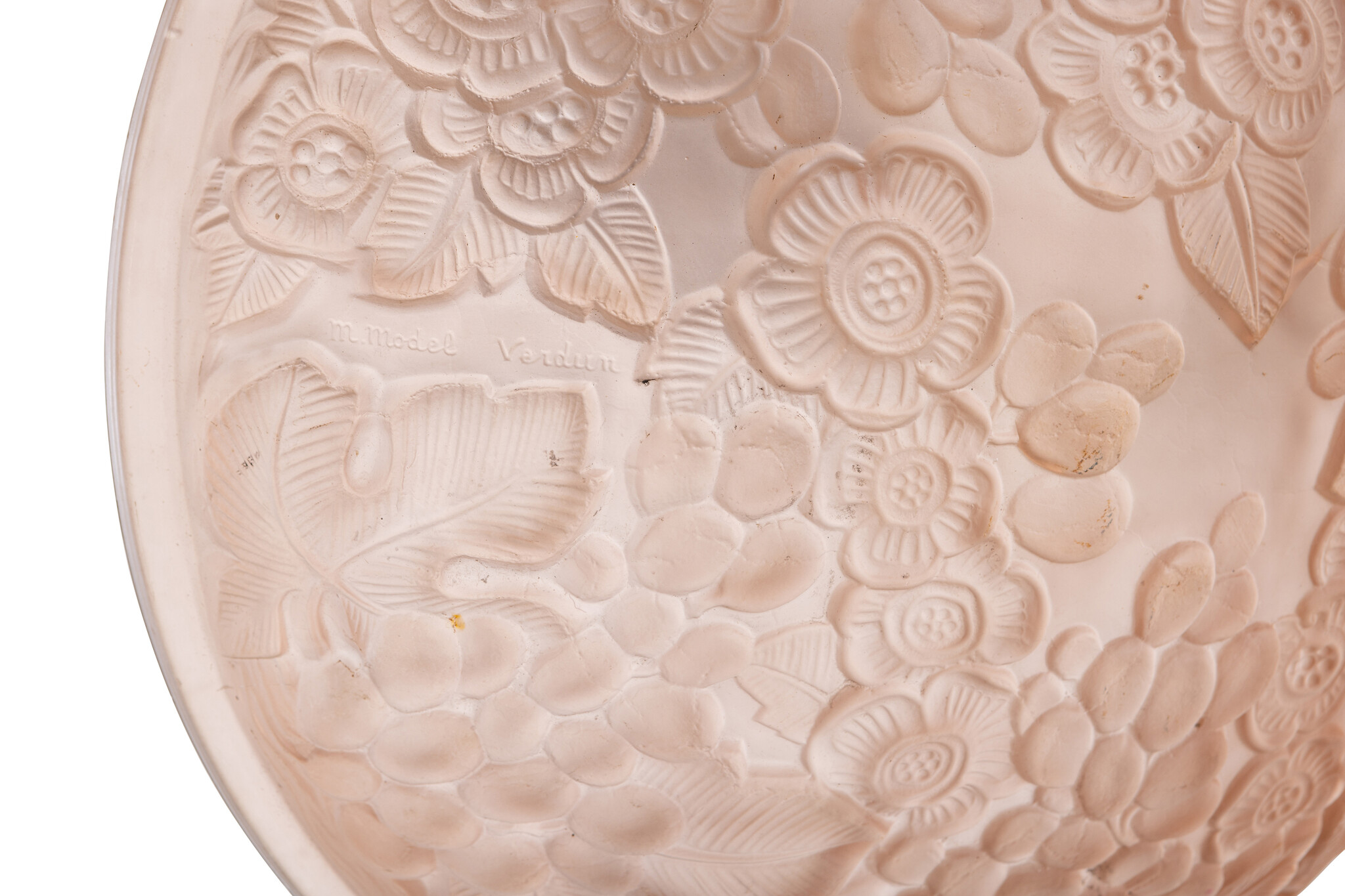 The bowl is made of thick pink glass.