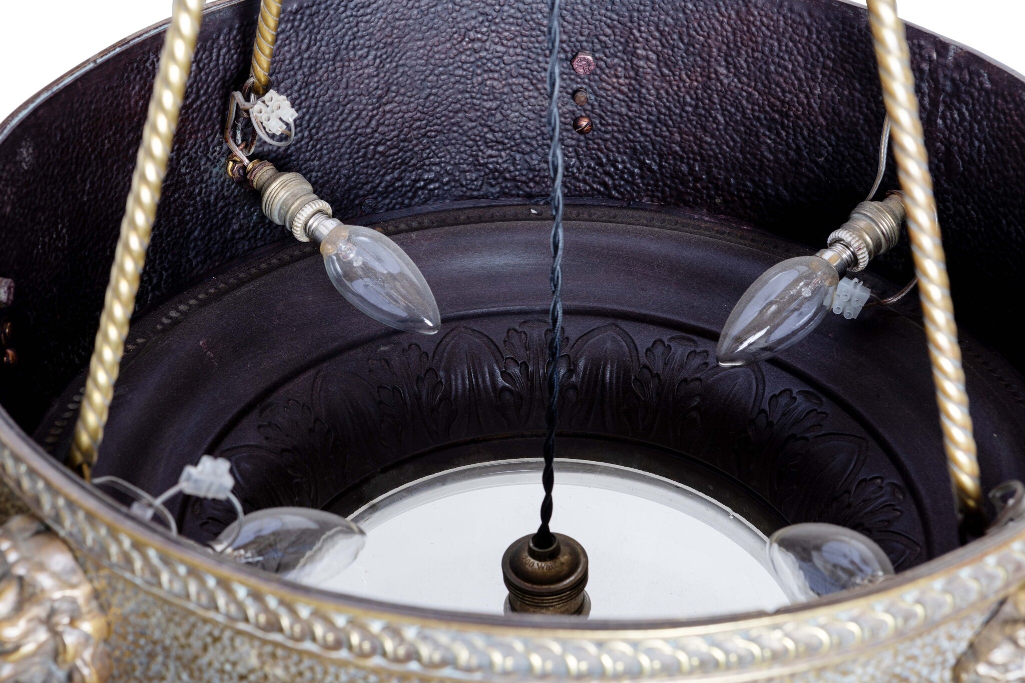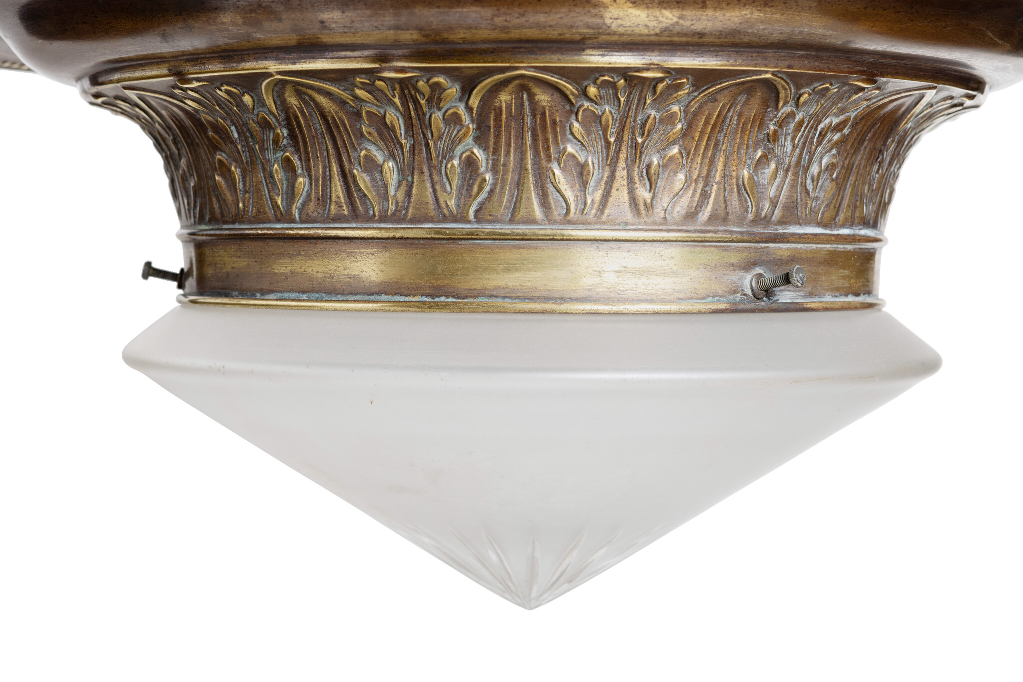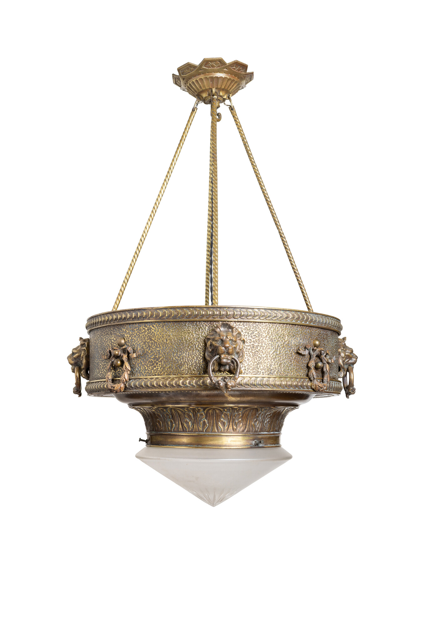 A cut glass shade in the shape of a point rests in the copper bowl.