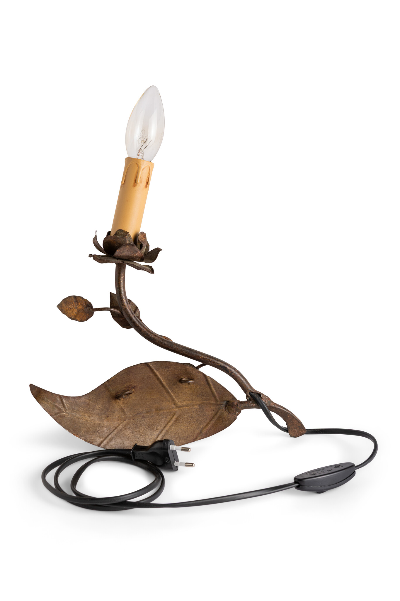 A beautifully made fixture, a branch with leaves, ending in a flower bud, very special.