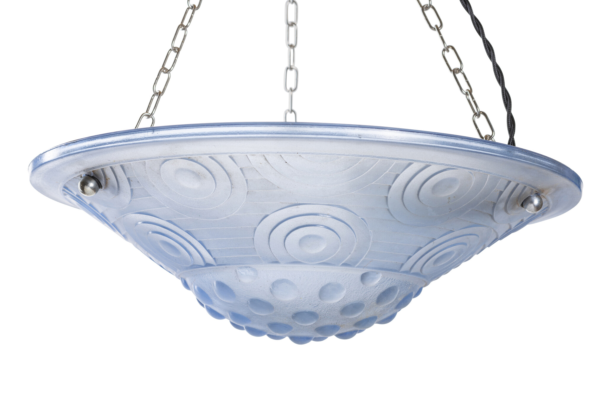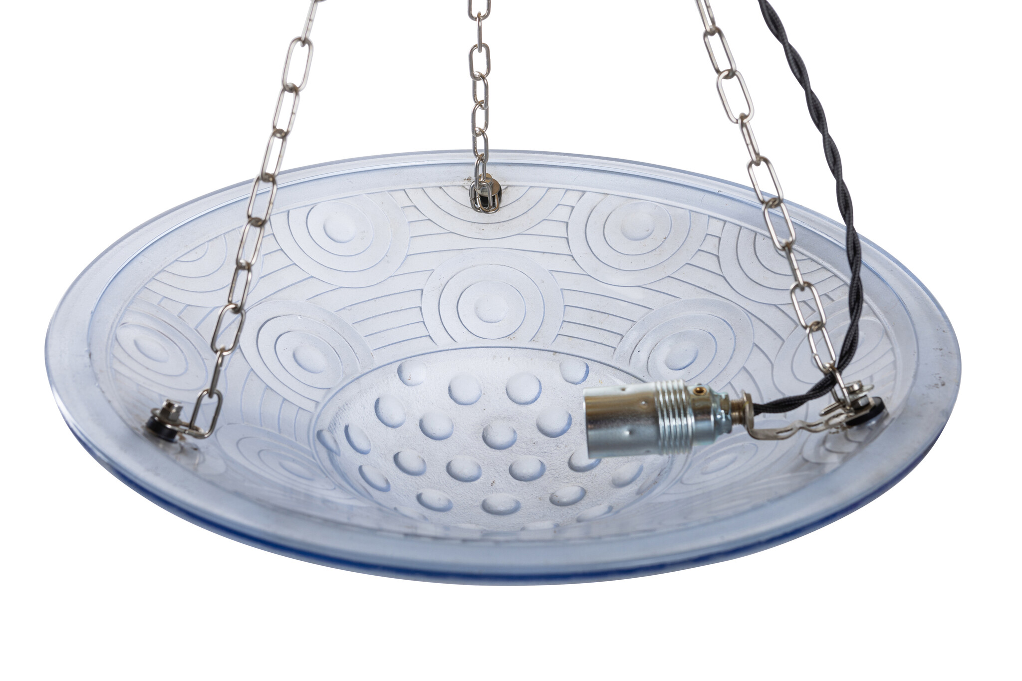 A blue glass bowl on 3 silver-colored chains.