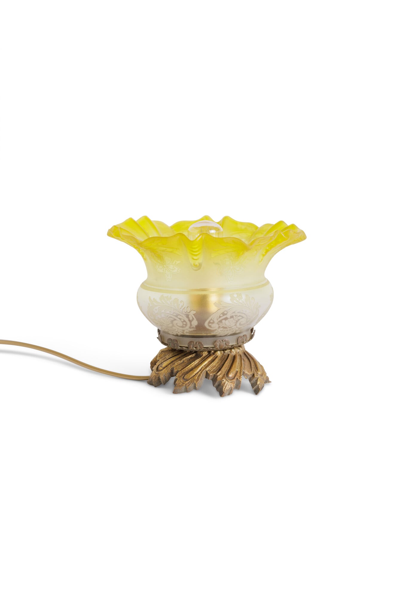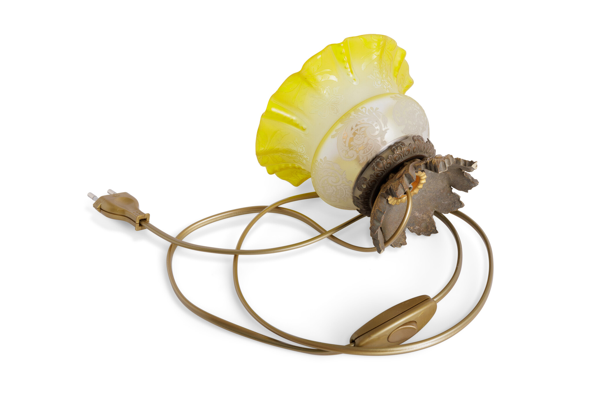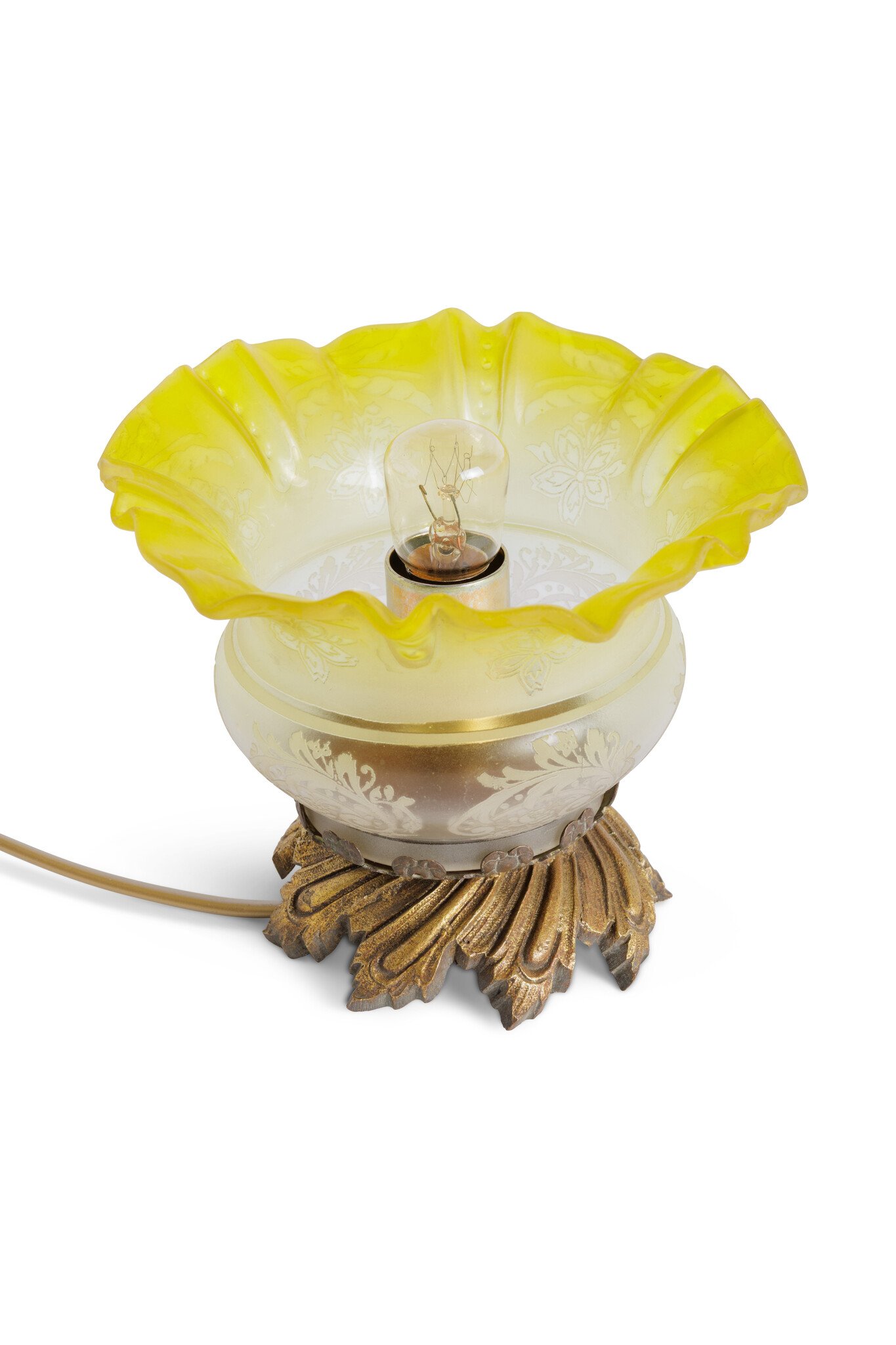 The glass shade is masterfully cut and features a unique color gradient: starting with a soft frosted glass base, she transitions into a vibrant yellow-green towards the top.