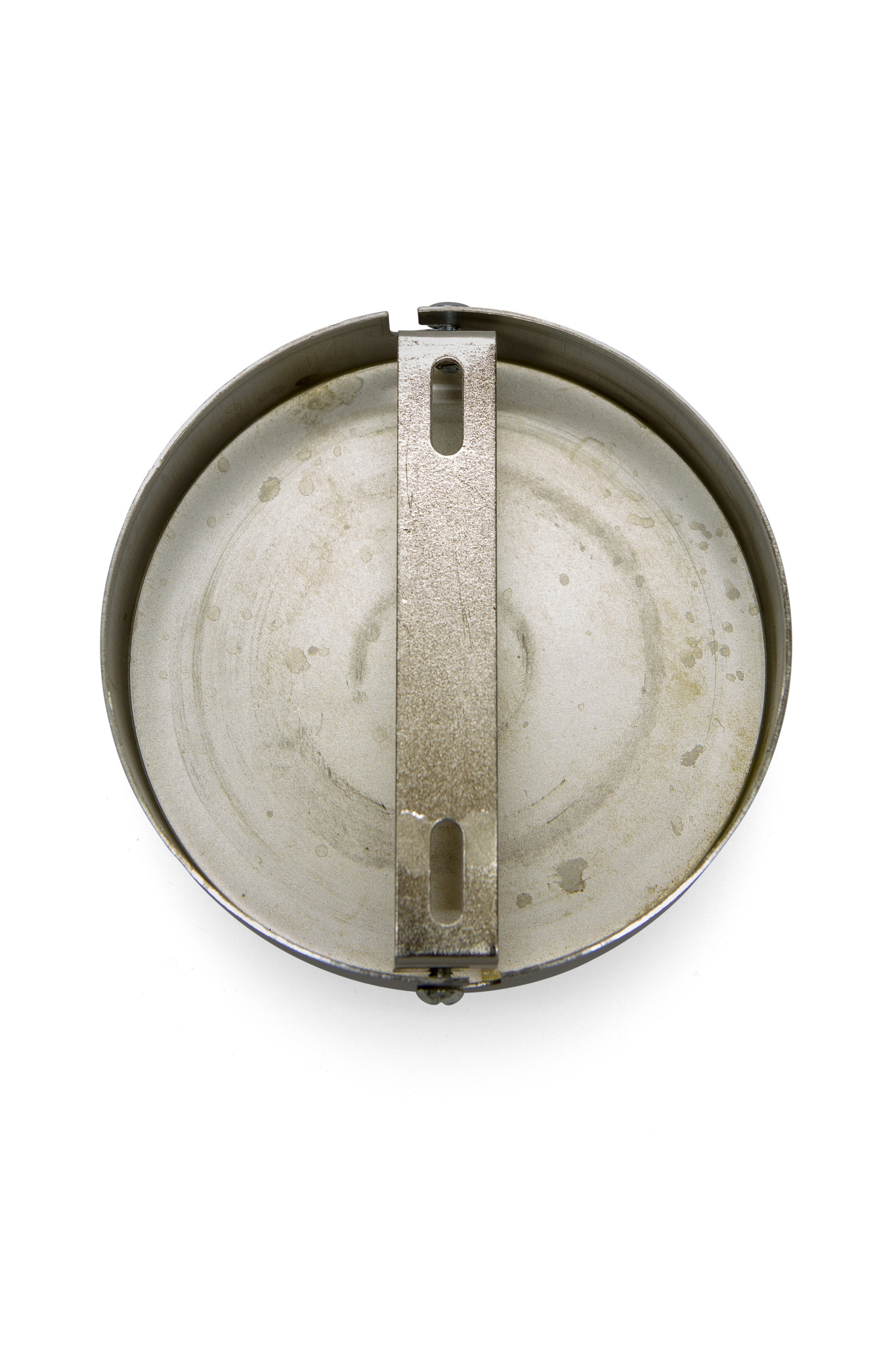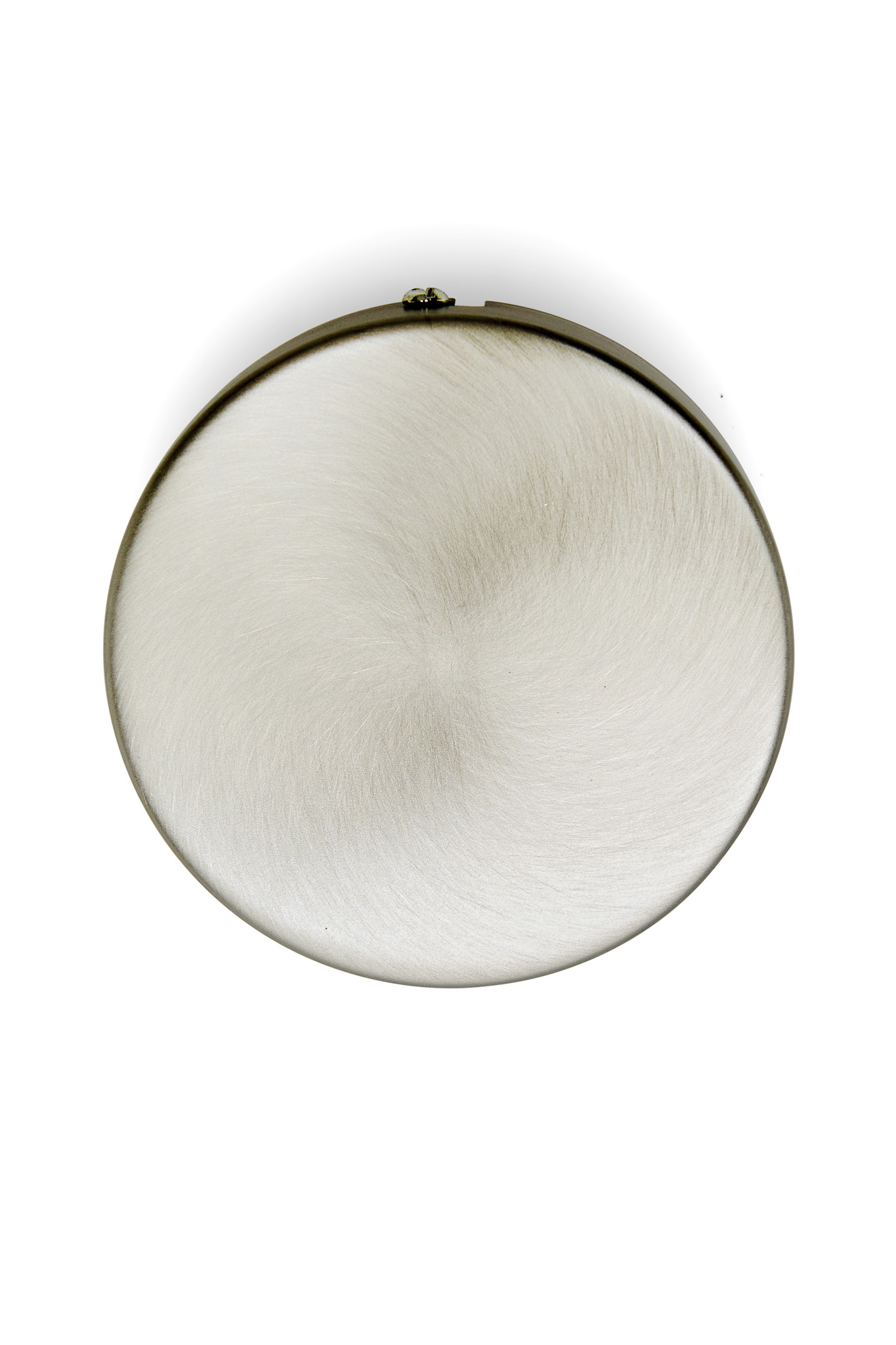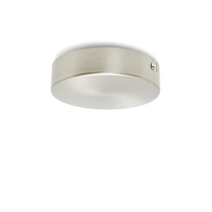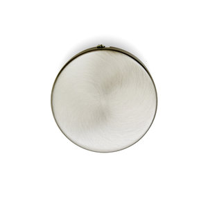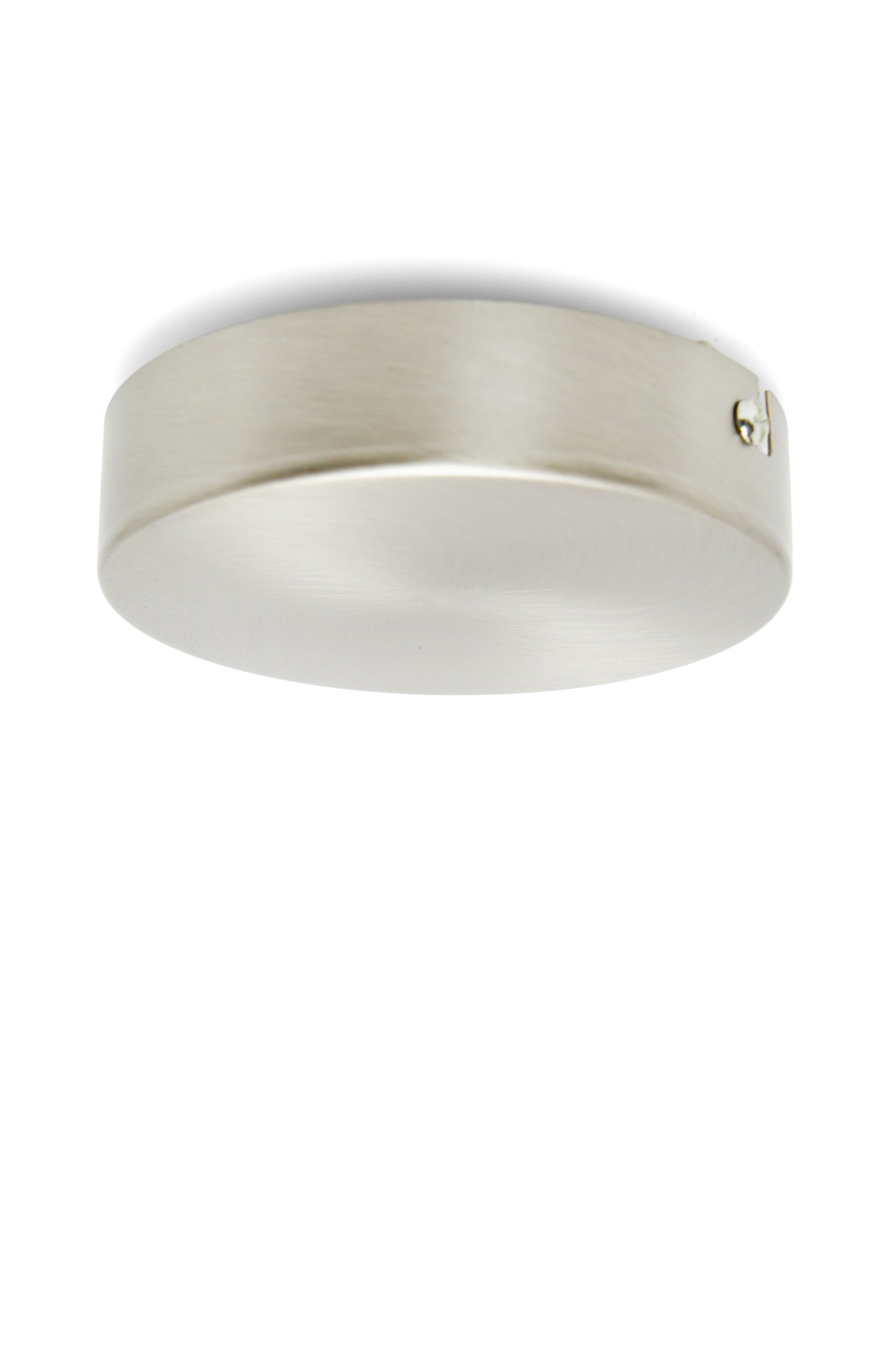 Round and fairly flat ceiling cap, made of matt nickel (matt silver colored).