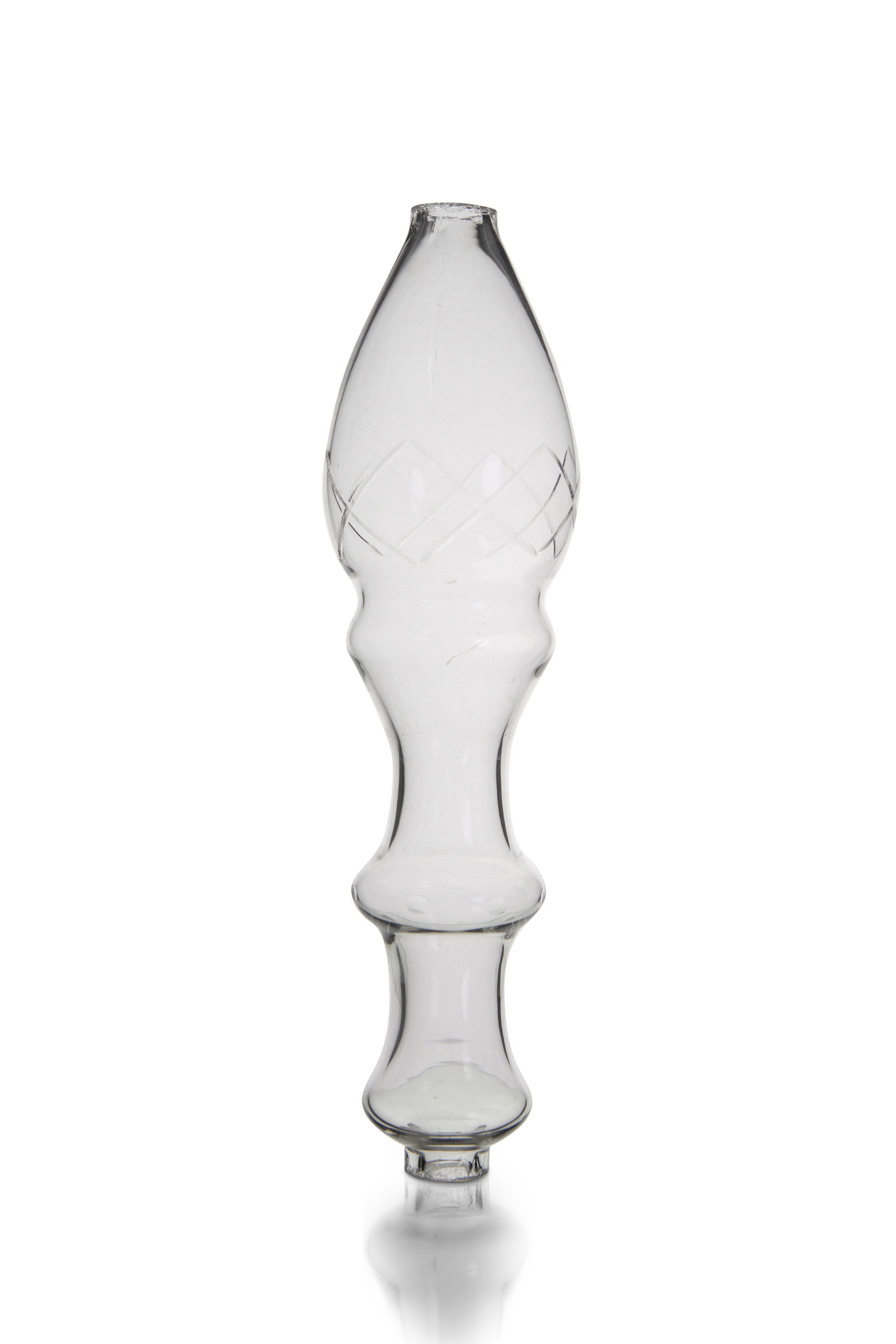 Slide the glass over the electrical conduit in the center of the chandelier.