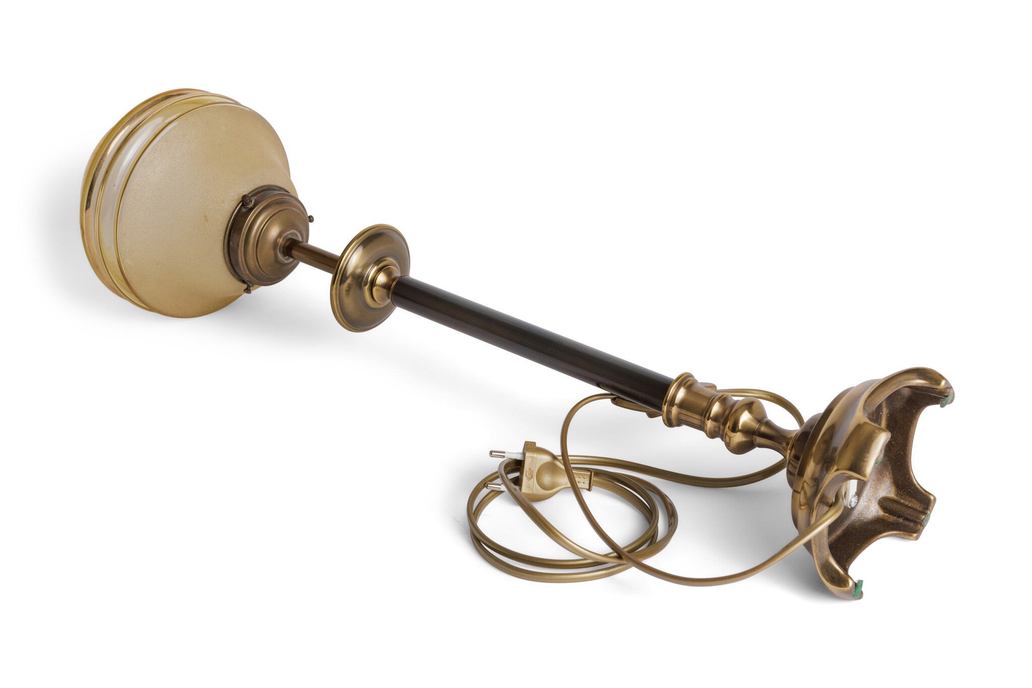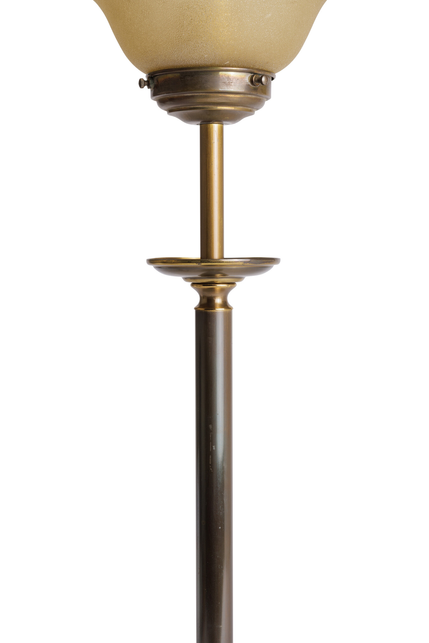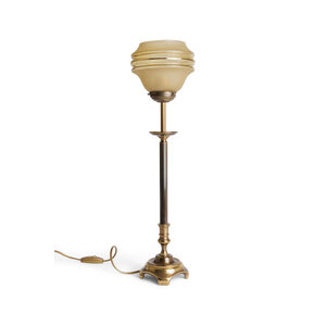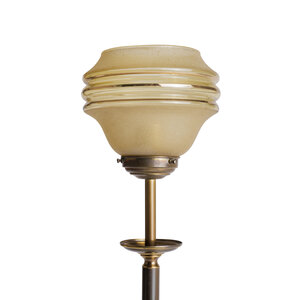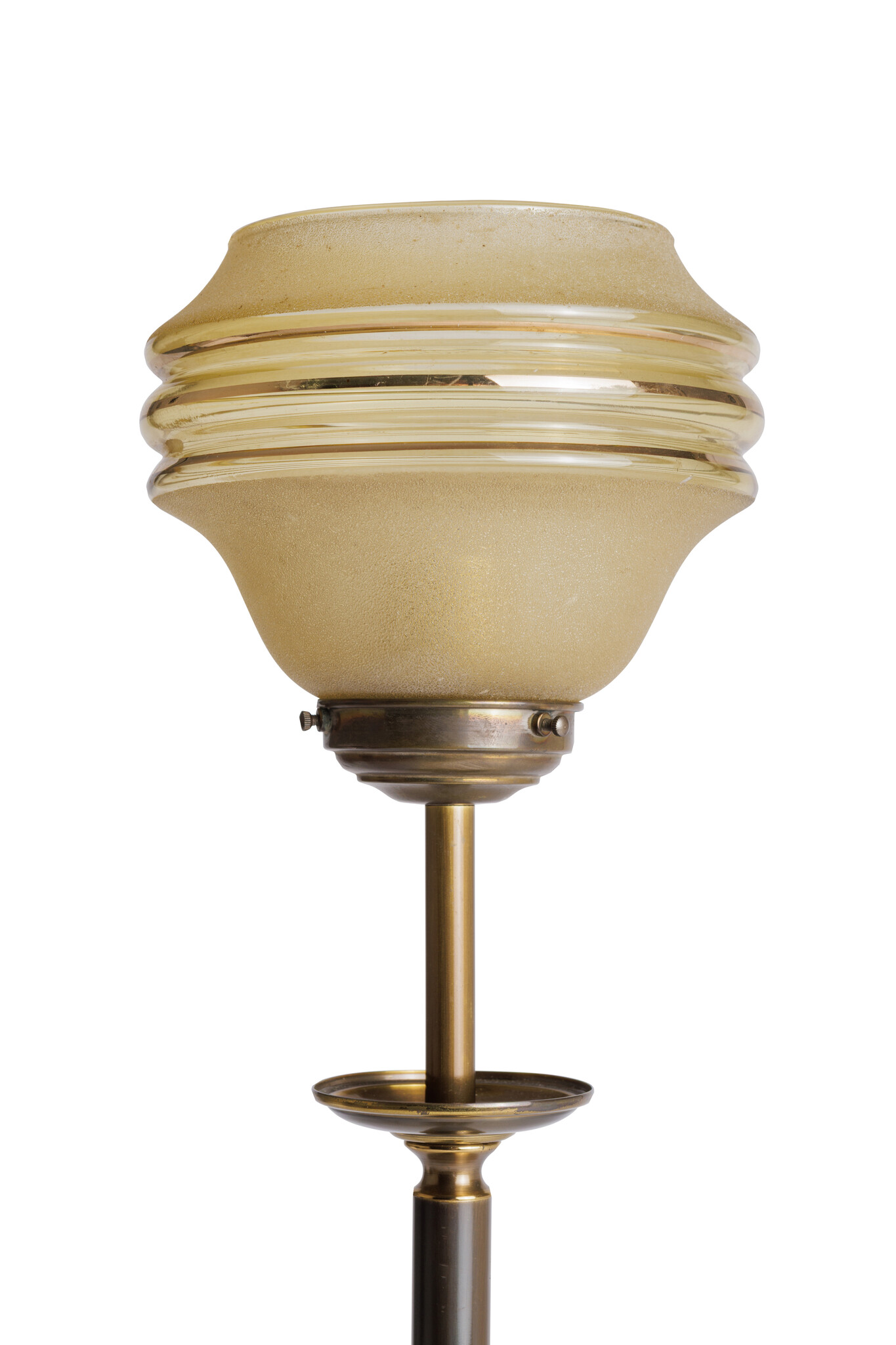 The glass shade plays with light using both frosted and clear sections. The horizontal gold rings wrapped around it add a touch of Art Deco glamour. Whether placed on a large sideboard or a stately desk, this lamp instantly brings a warm, luxurious atmosphere to your home.