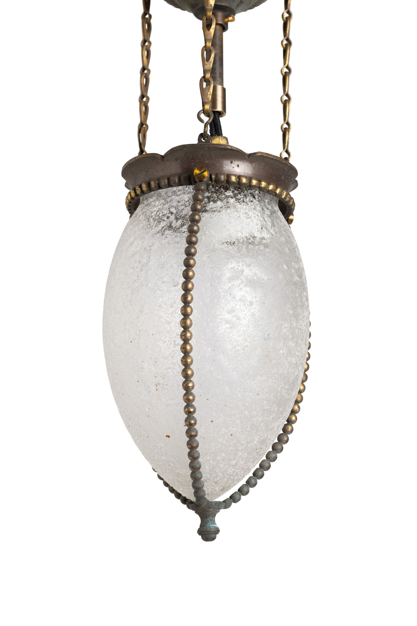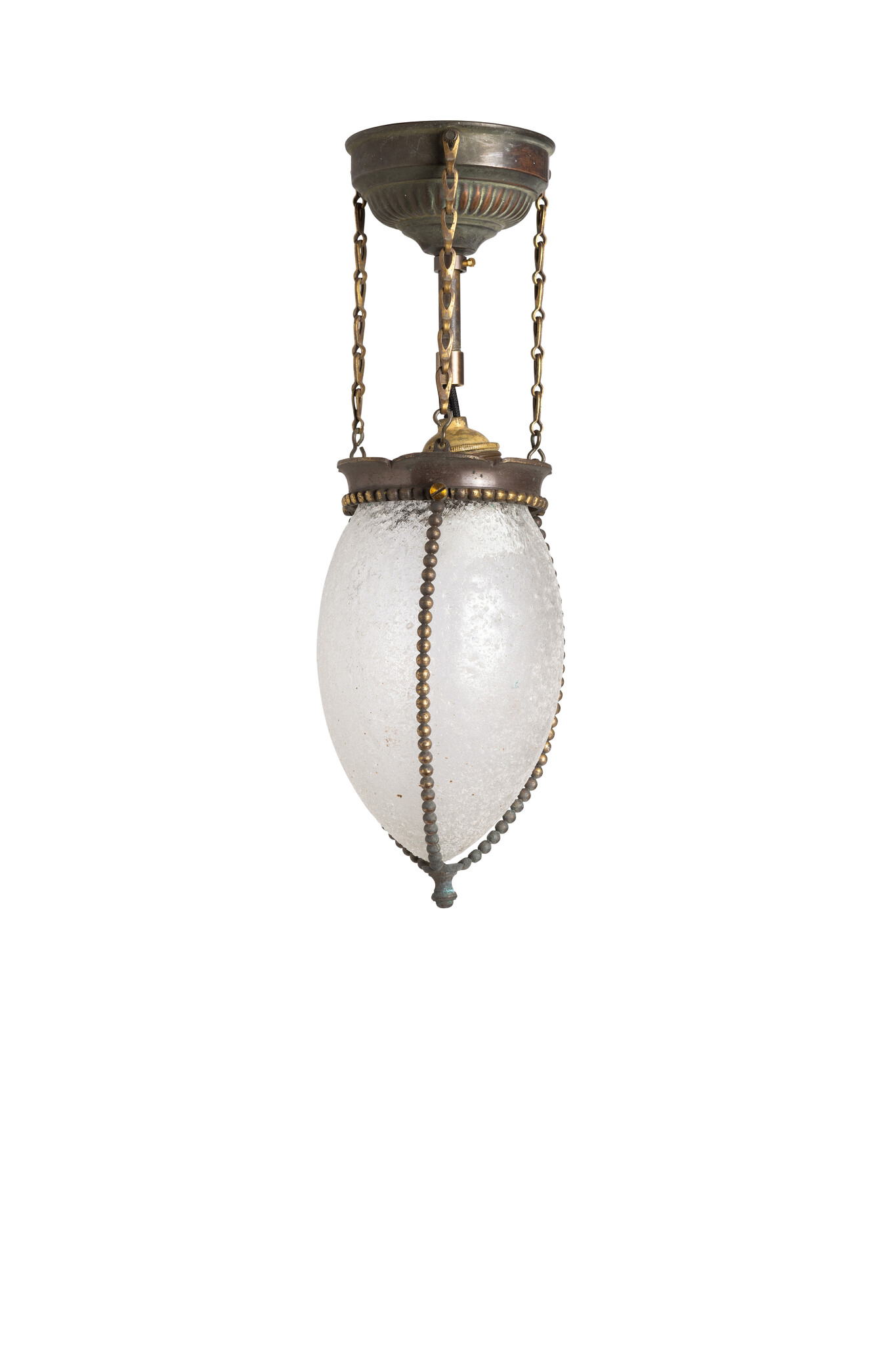 The glass hangs in a beautifully crafted, burnished brass fixture.