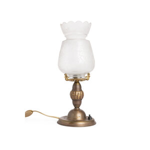 A burnished brass base with a glass shade on top.