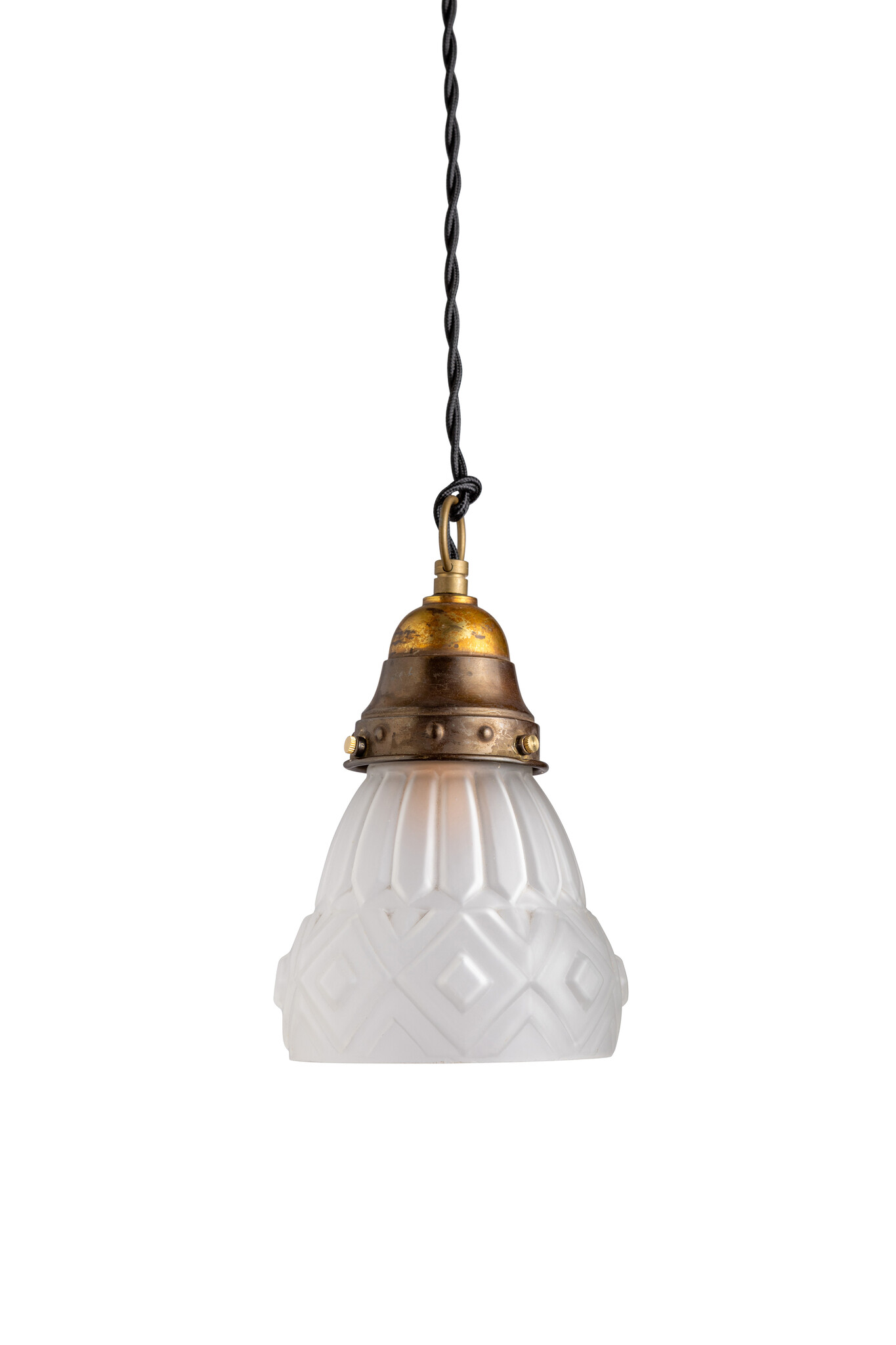 This atmospheric lamp hangs from a black, twisted fabric cord and is finished with warm, brown copper holders. The frosted glass shade casts a soft light, creating a cozy, inviting ambiance in any room.
