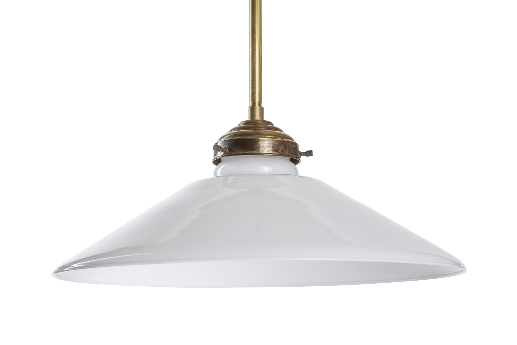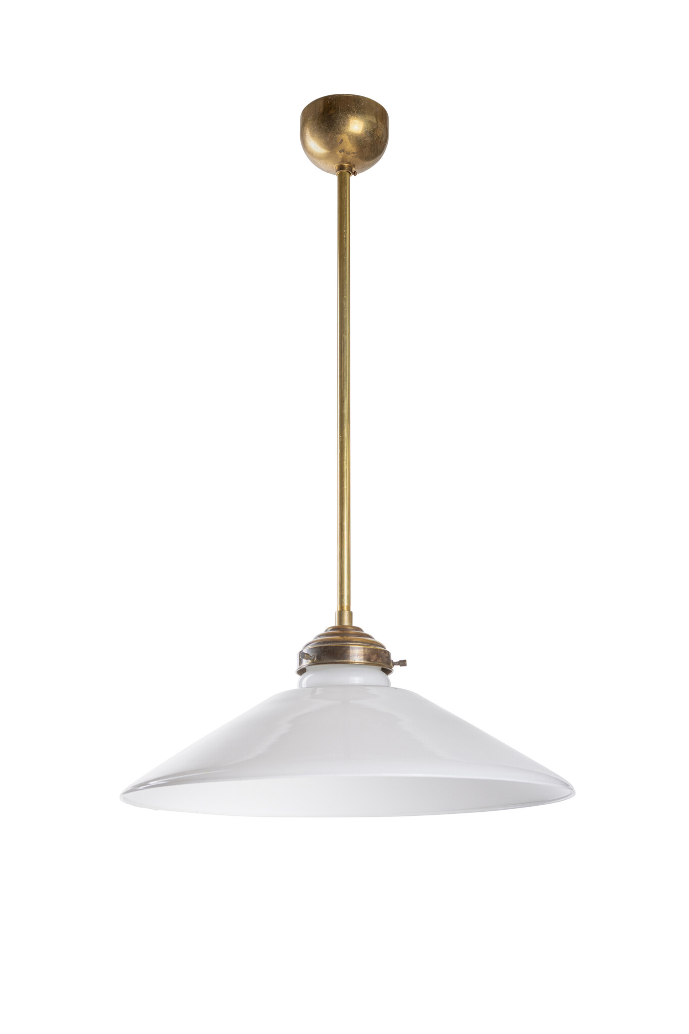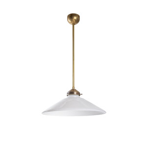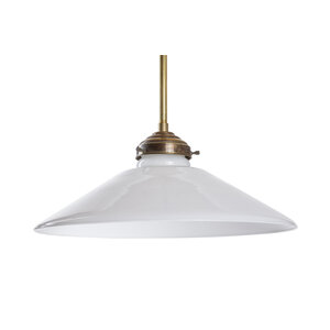 A gold-colored pendant with a white glass shade.