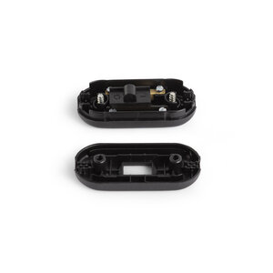 To open: remove the two screws, see 2nd photo (silver colored circles).