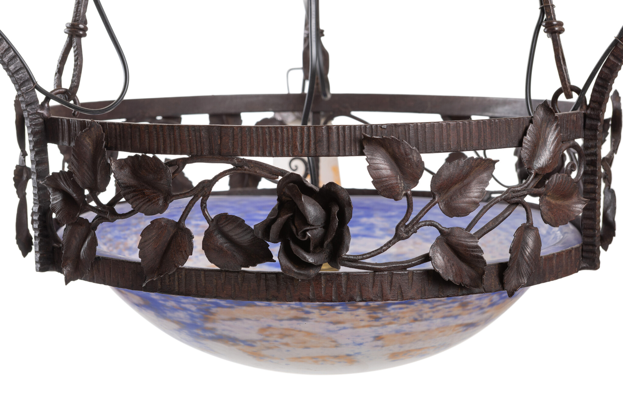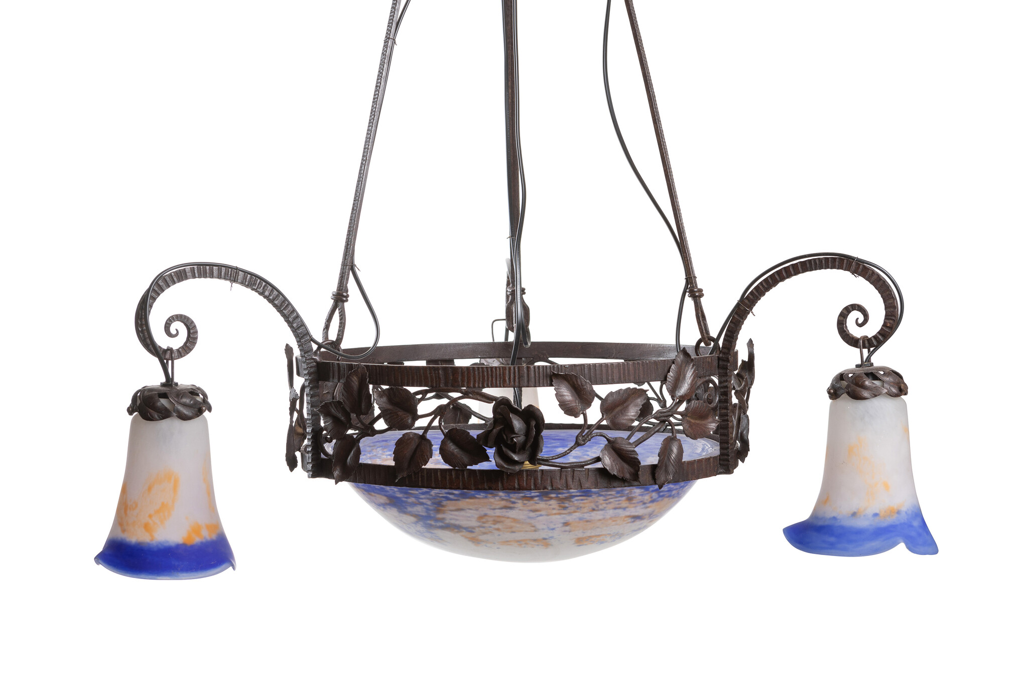 Due to age (and use of the lamp in the past approximately 90 years), one lampshade has minor damage to the edge, where a small shard of glass is missing, see also the 4th photo.