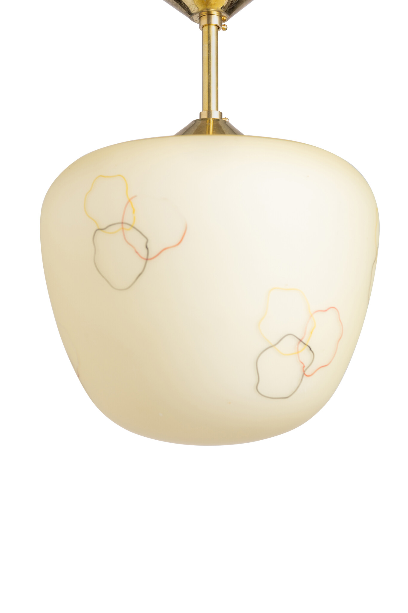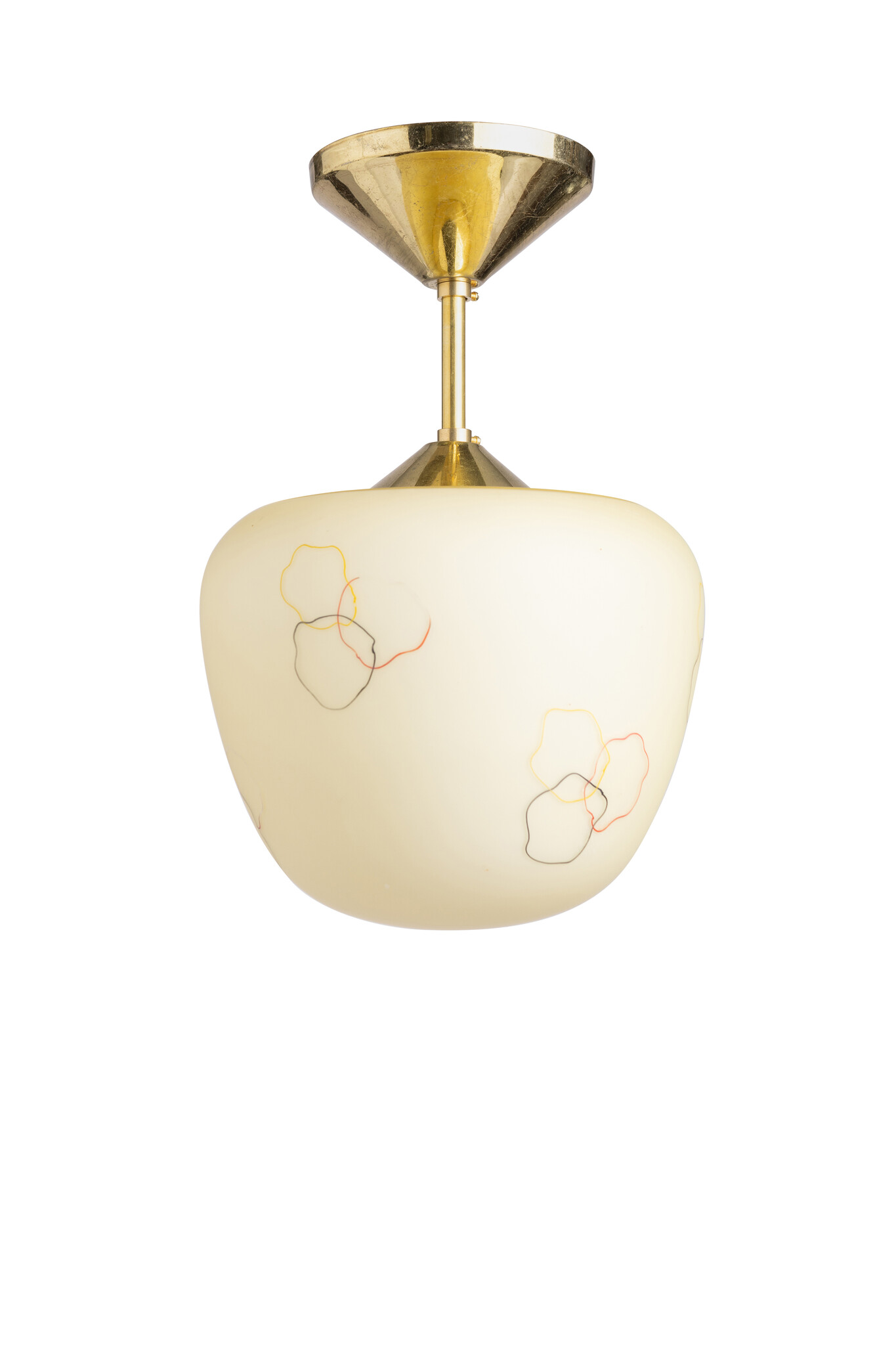 Cheerful hanging lamp, quite close to the ceiling. Placed around the 1950s.
