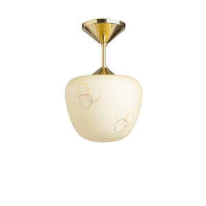 A gold-colored fixture and a light yellow glass ball with a small pattern on it.