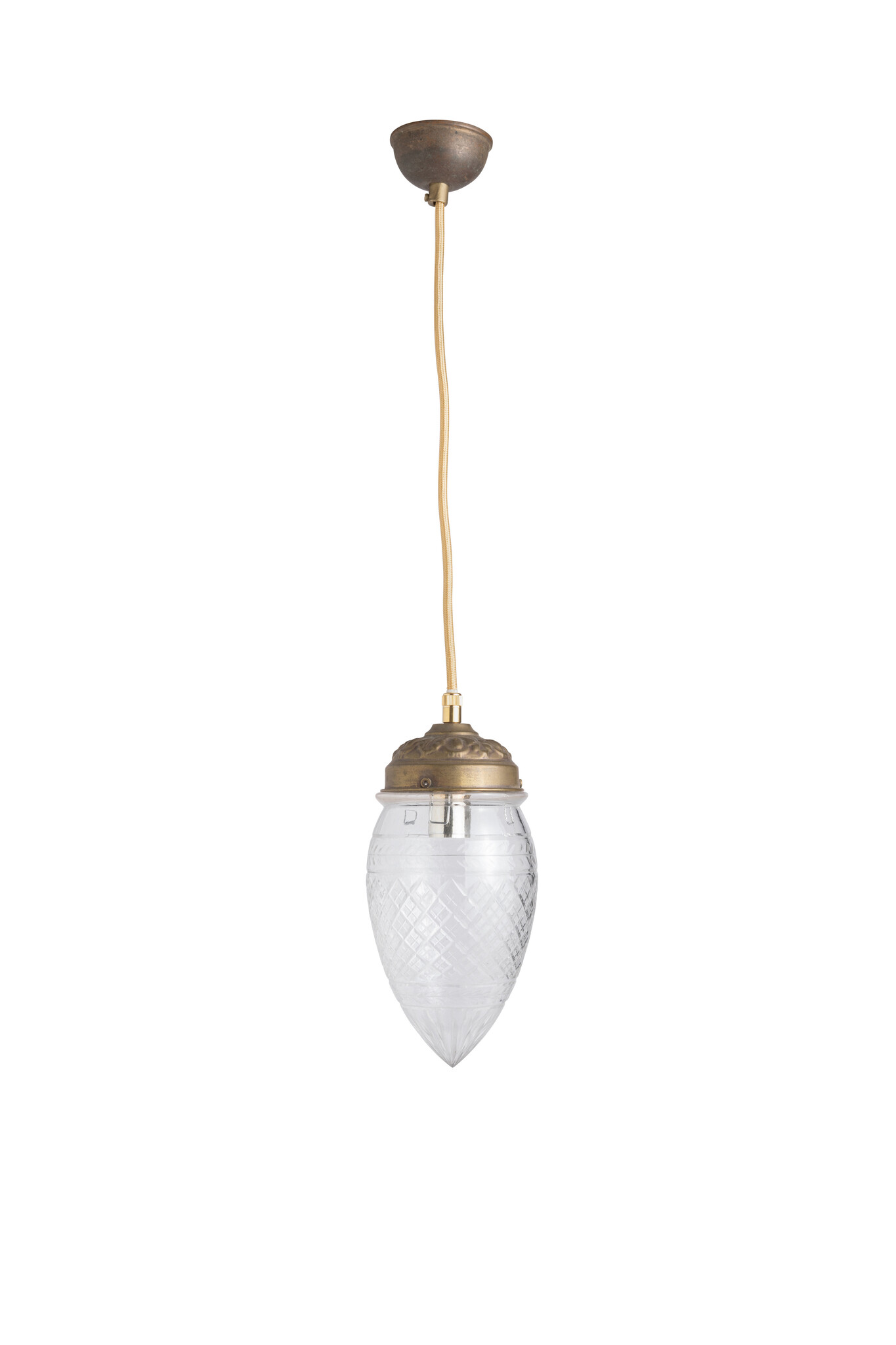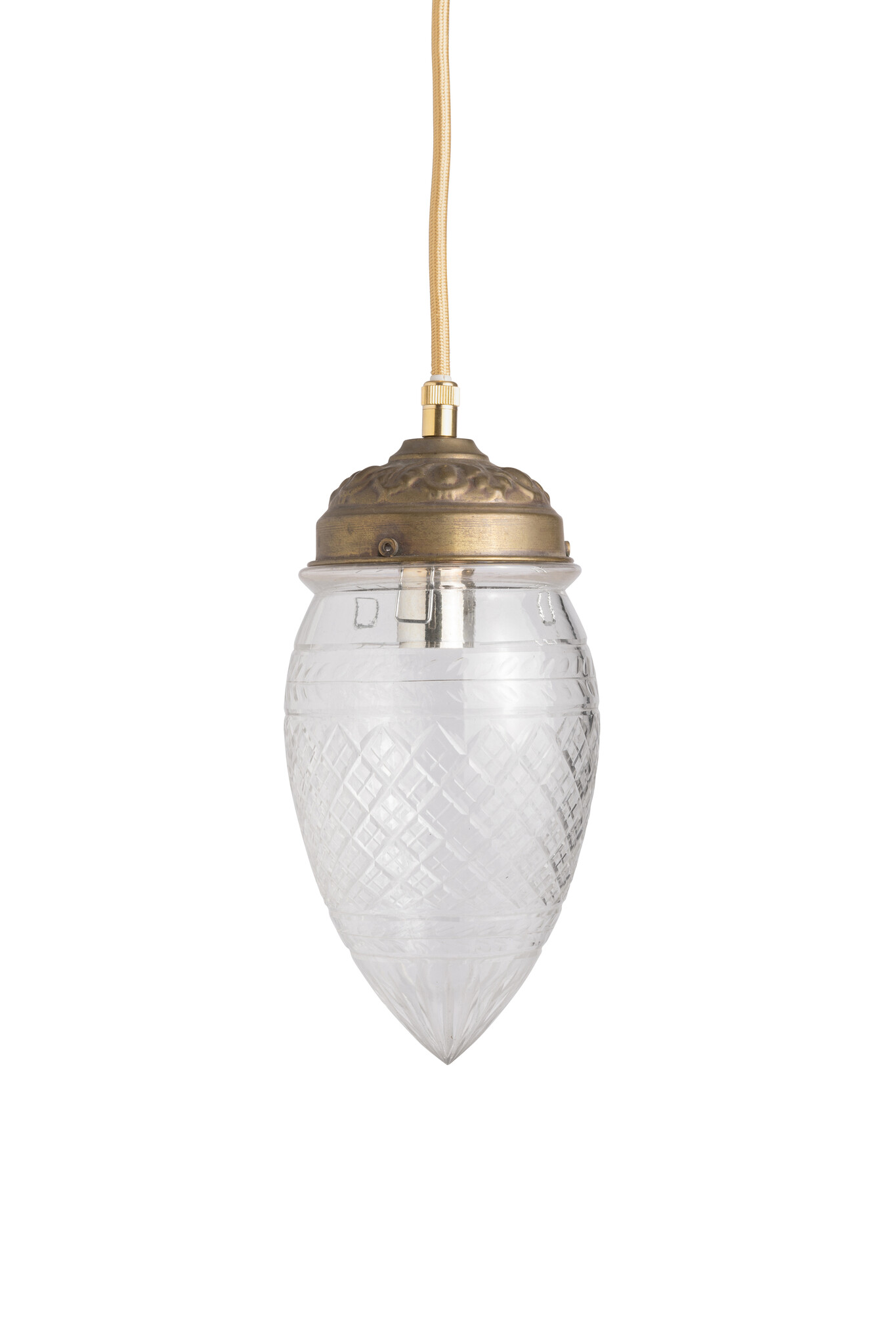 The glass shade hangs on a gold round fabric cord.