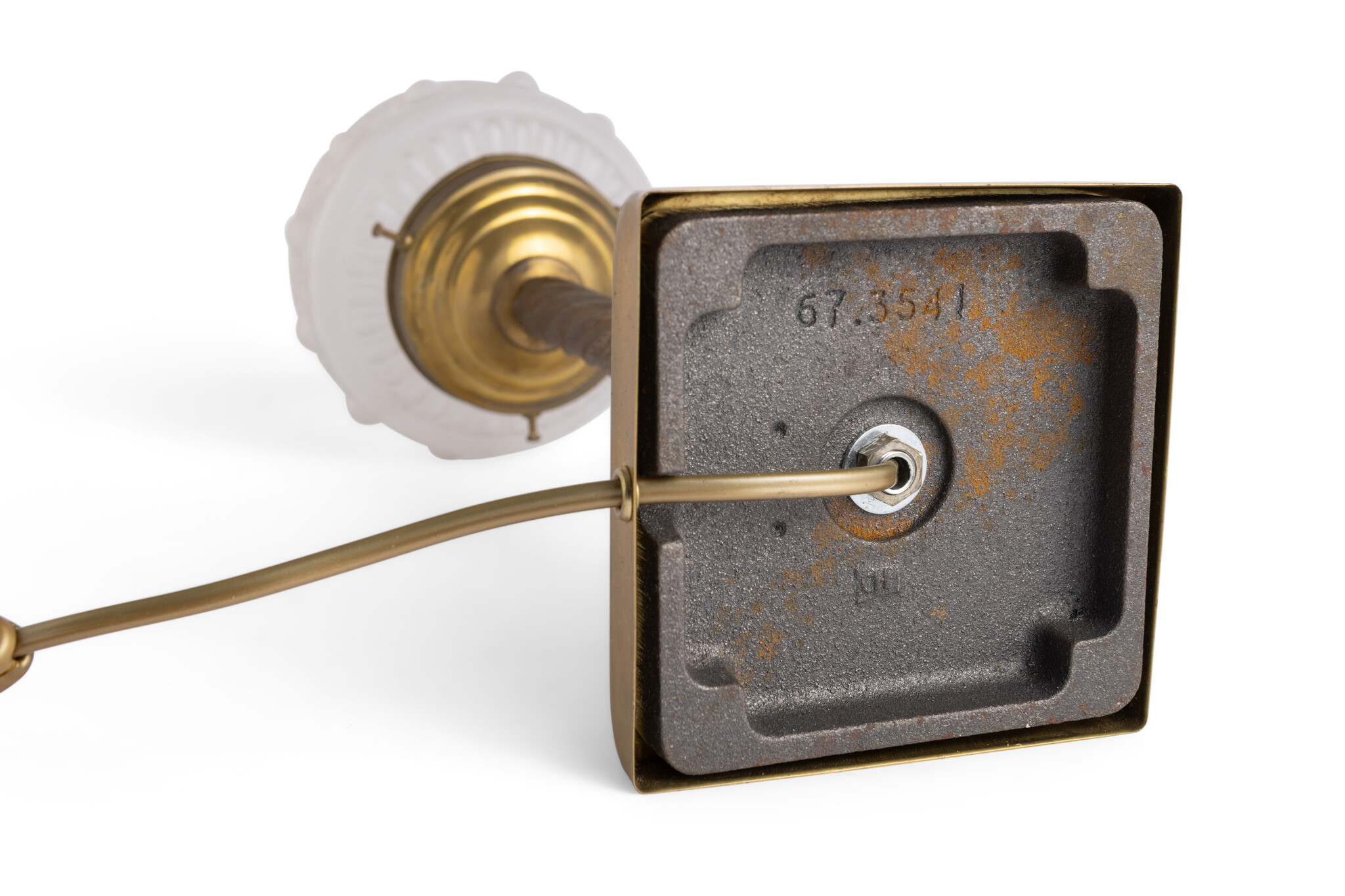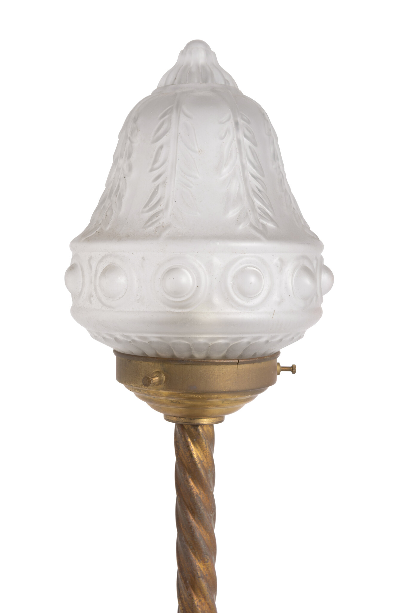 A brass base with a frosted glass shade.