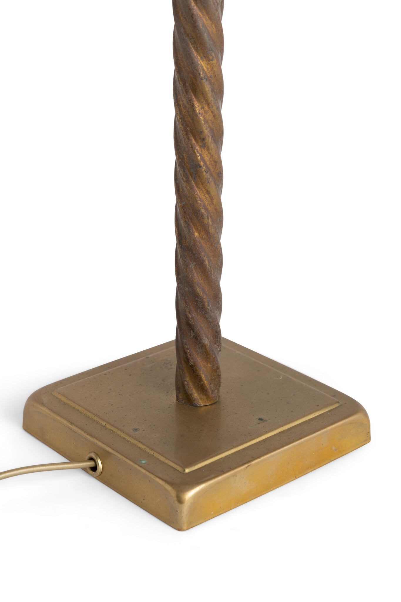 The table lamp is equipped with a gold-colored cord with plug and switch.