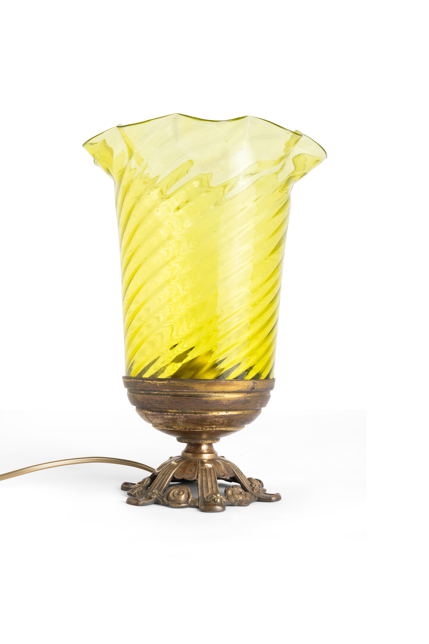 A gold-brown brass base with a (transparent) green glass lampshade.