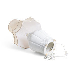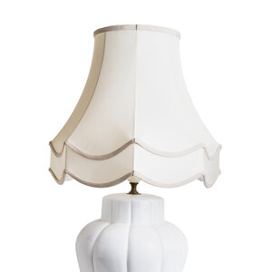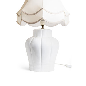 A white ceramic base with a fabric lampshade.