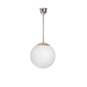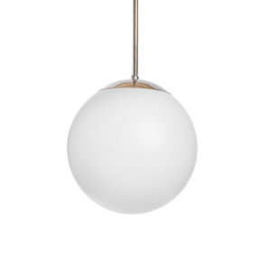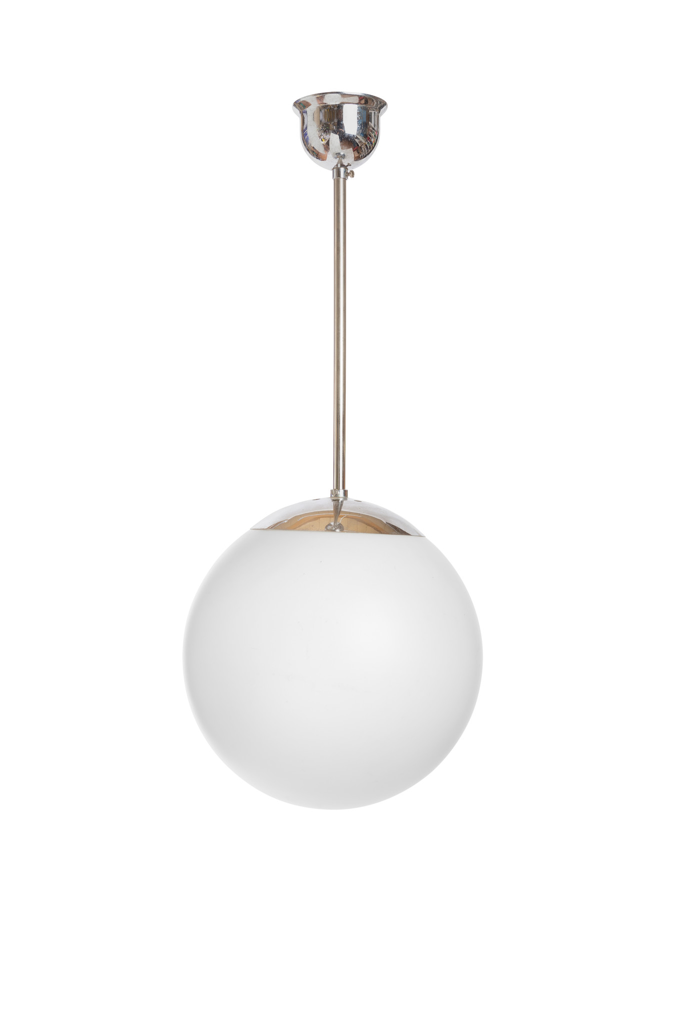 A white glass sphere on a metal pendant.
