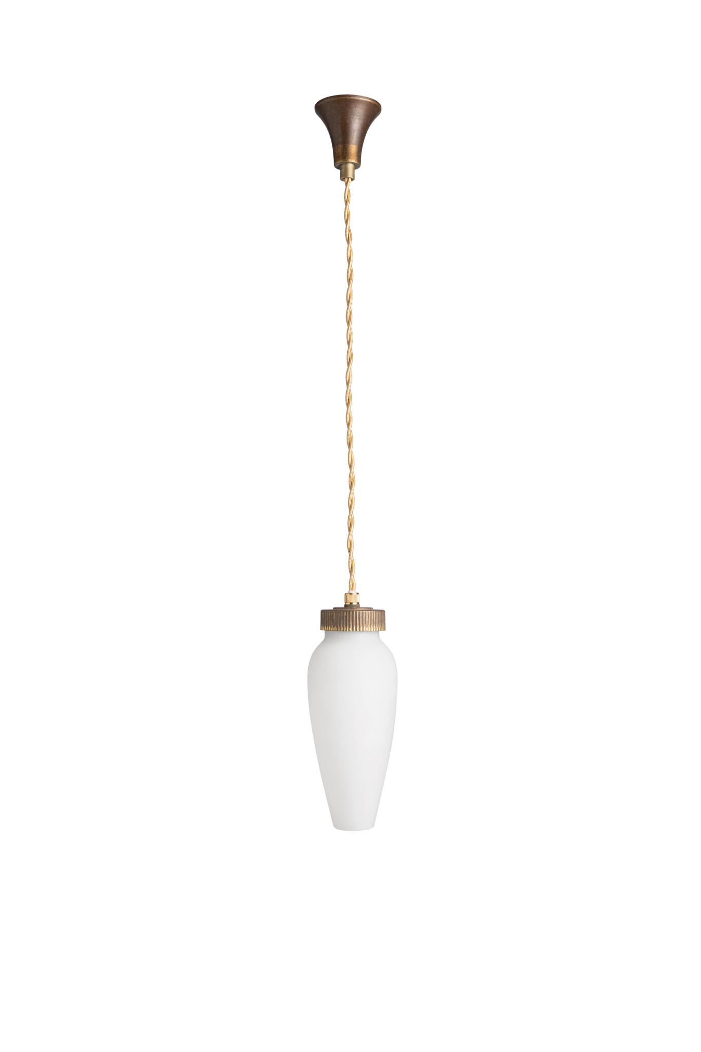 The glass shade hangs from a gold-colored twisted fabric cord.