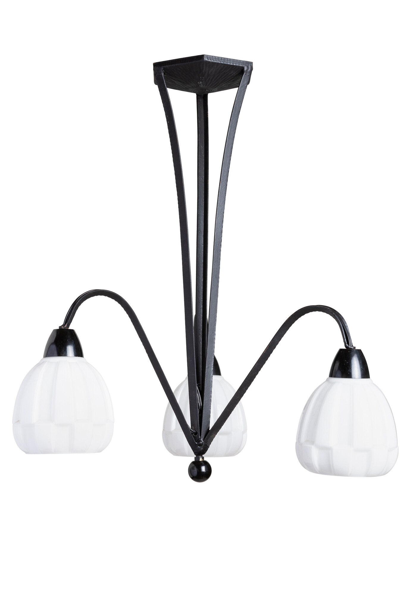 Stylish Art Deco pendant lamp from the 1930s. A sleek, angular metal frame with three white glass lampshades. Truly simple and minimalist, yet still very beautiful.