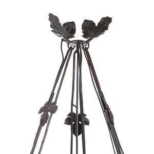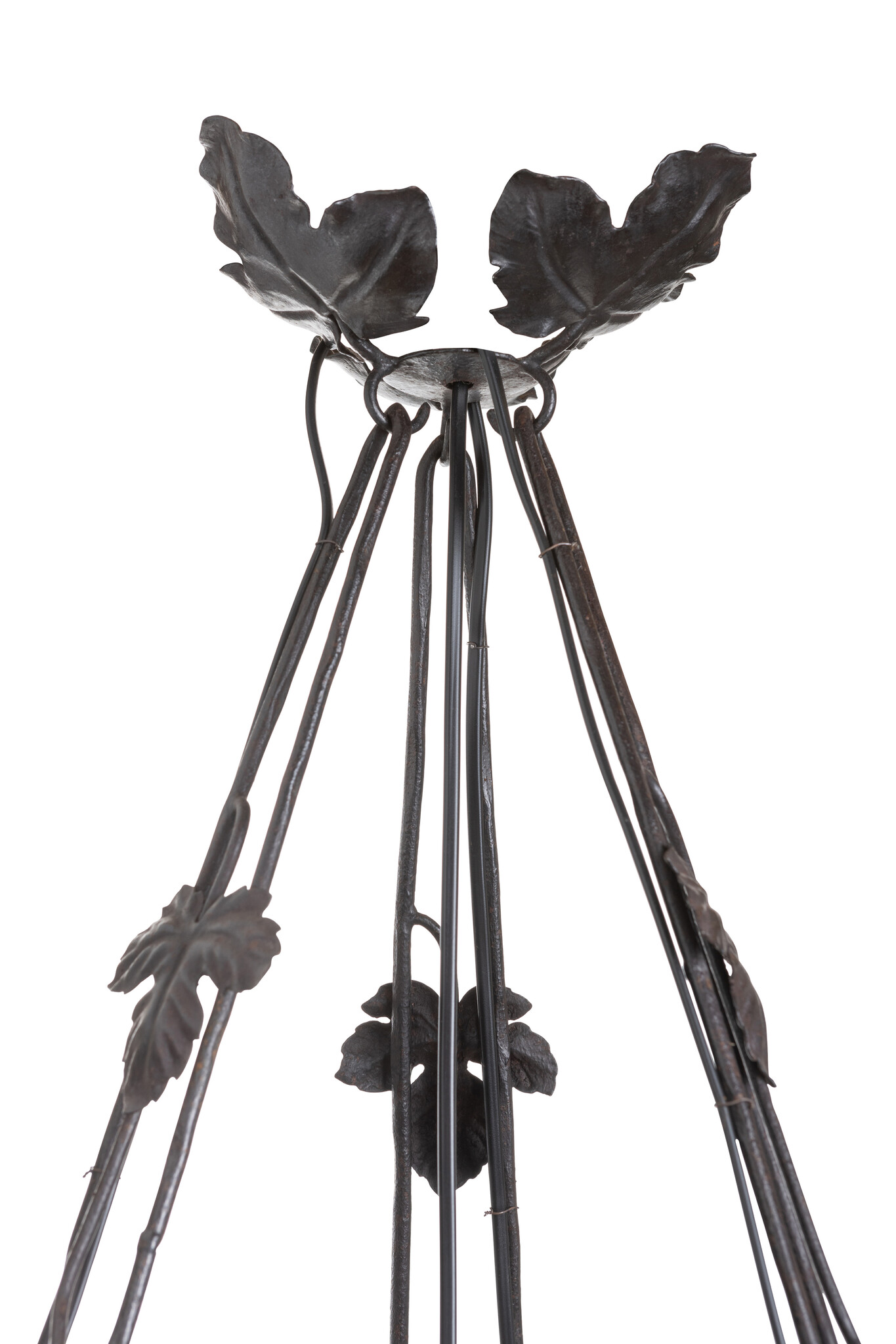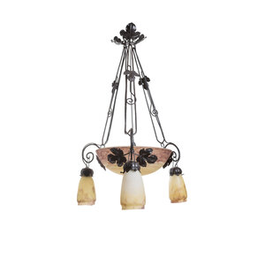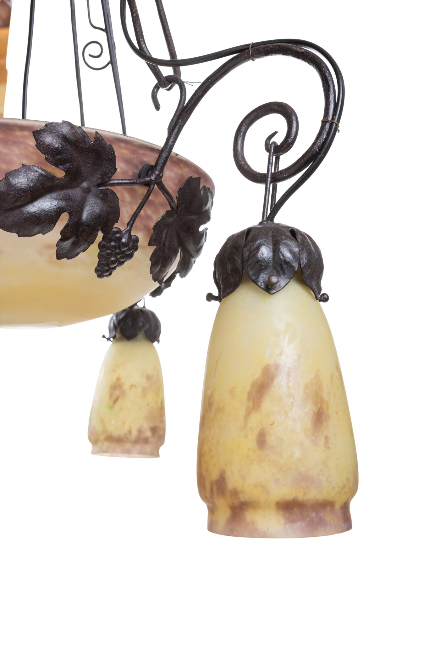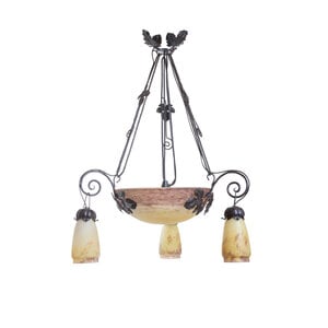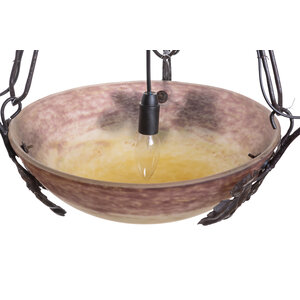 A black wrought iron frame with a glass center bowl and 3 lampshades on the side.