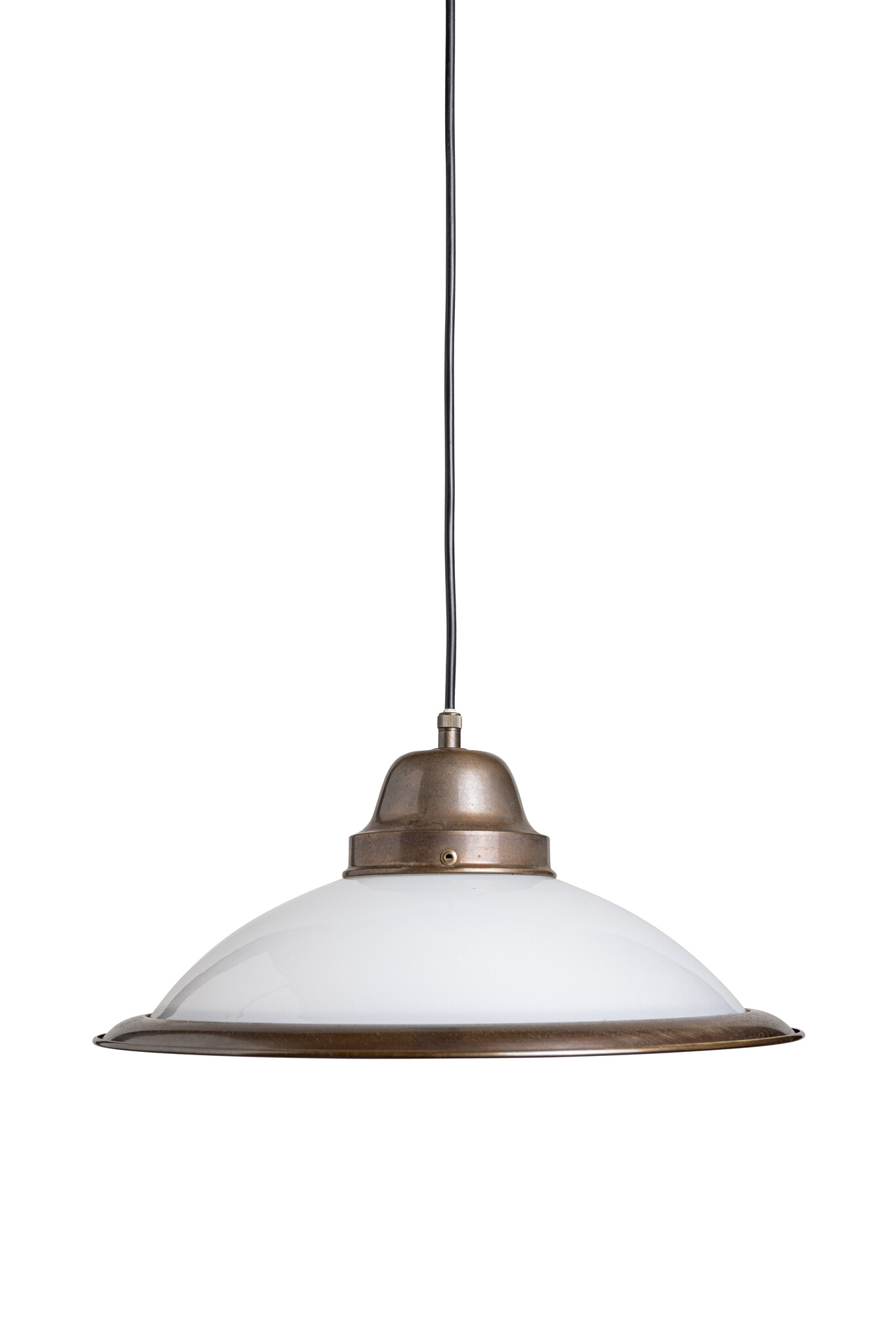 Authentic vintage pendant lamp with a spherical white glass shade and a distinctive brown copper band.