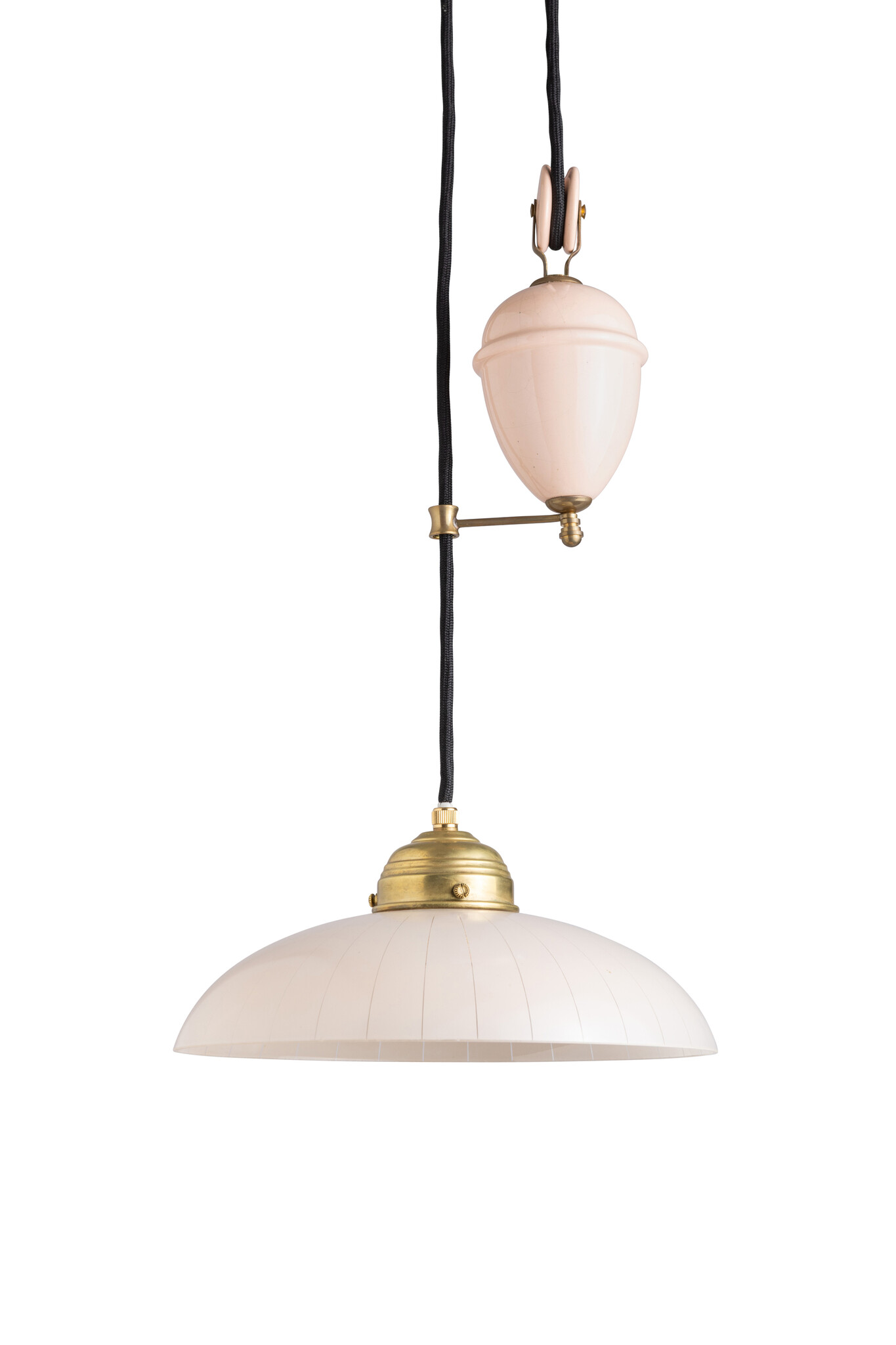 This beautiful pink pendant lamp combines elegant glass with an authentic porcelain weight and a supple black cord. The clever pulley system, popular in the 1930s and 1940s, allows for easy height adjustment: up for bright, diffused light or down for atmospheric, focused illumination. Once a familiar sight above kitchen tables, it's now a unique and distinctive statement piece for your interior.