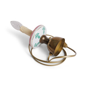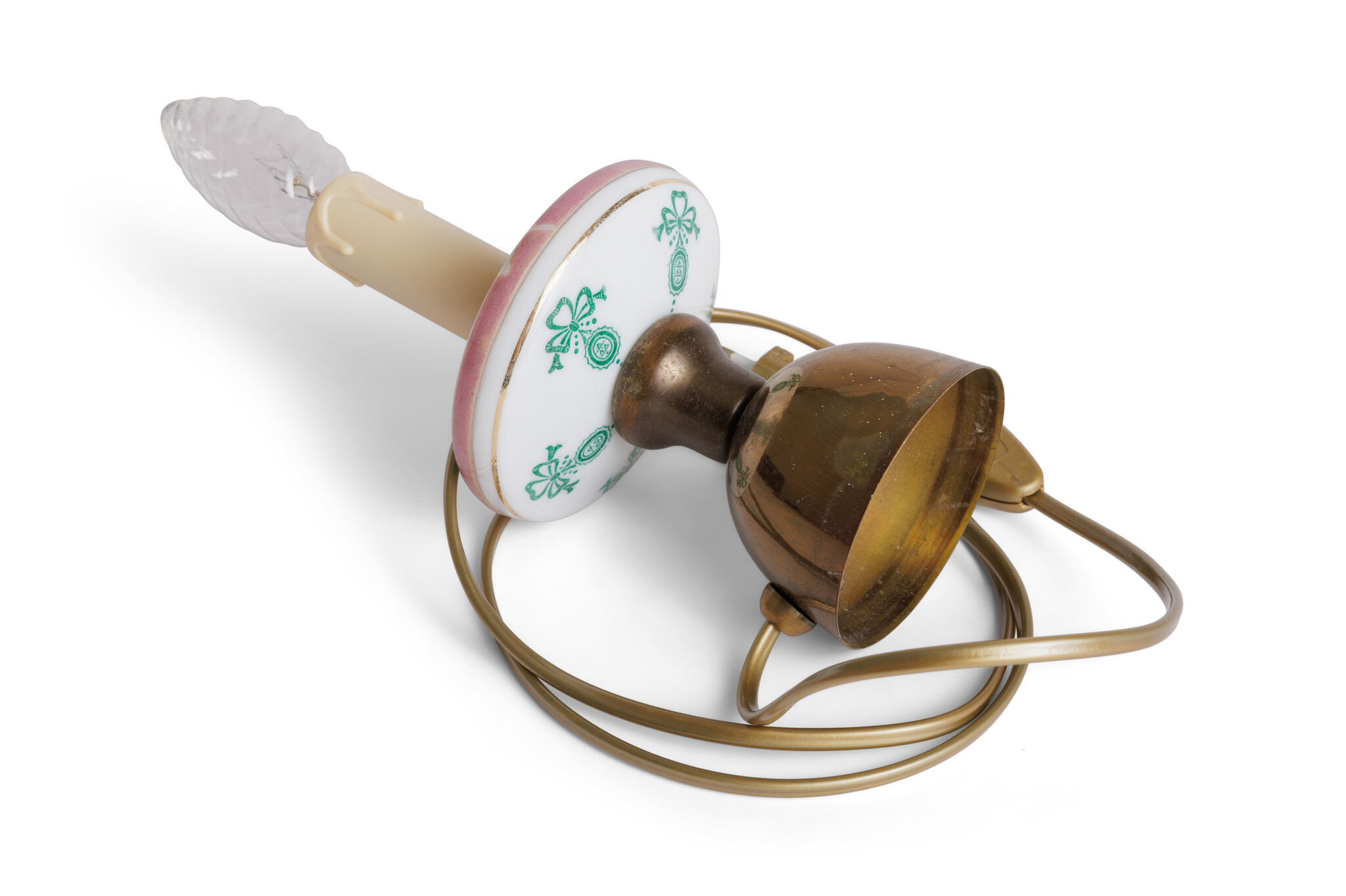 Dit kleine boudoir-lampje is een schatje om te zien. De basis is van warm koper, maar de echte blikvanger is het glazen schijfje in het midden. Het is prachtig gedecoreerd met fijne roosjes en groene strikjes, wat de lamp een heerlijke nostalgische uitstraling geeft.