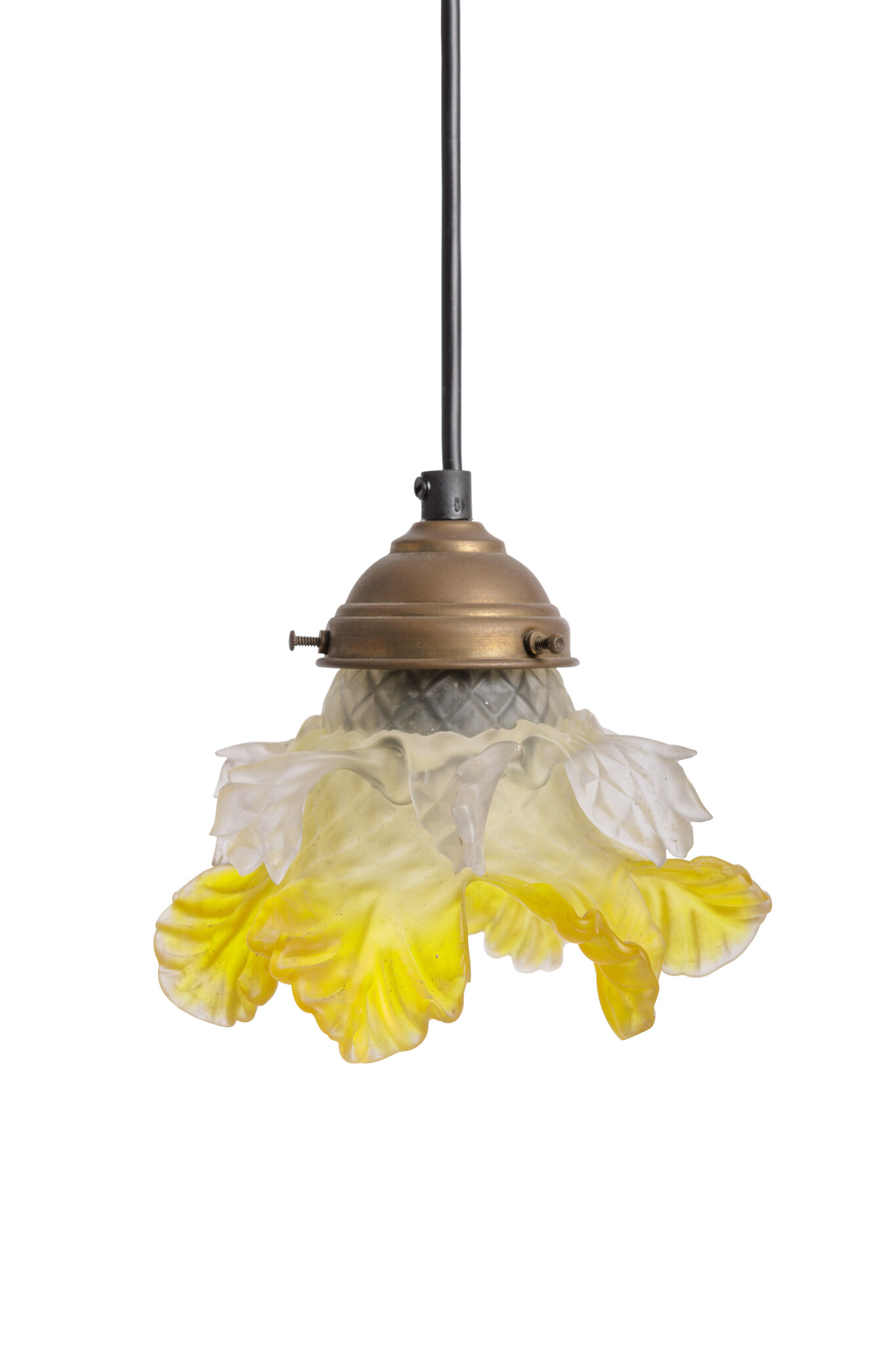 De glazen kap heeft de vorm van een kelkbloem met sierlijke blaadjes.