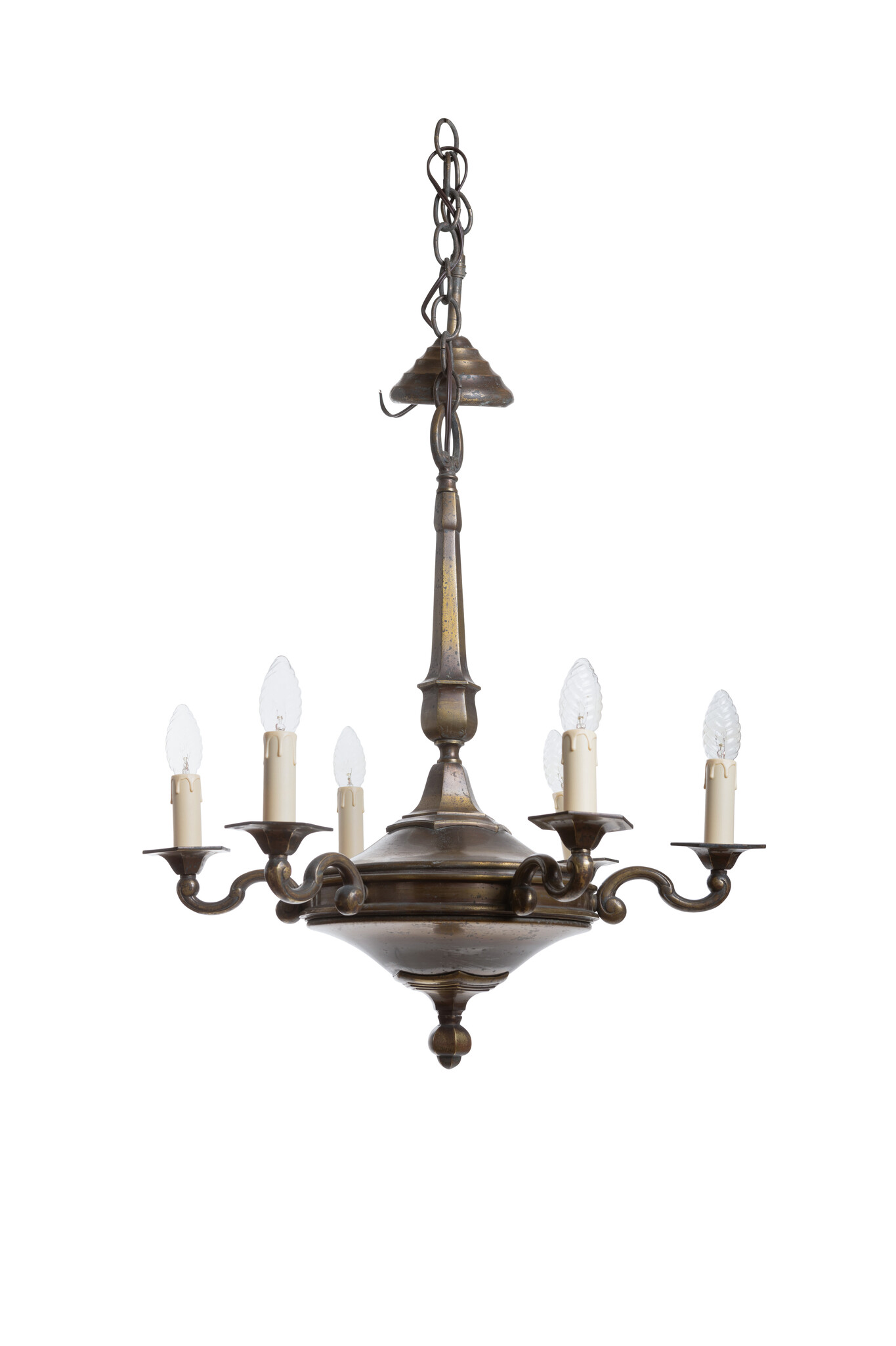 Gebruineerd en met 6 armen met elektrische kaarslampjes.