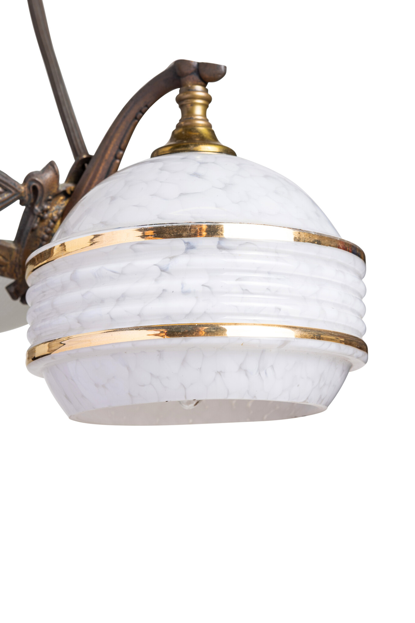 De lampenkapjes zijn wit gewolkt met twee goudkleurige biezen.