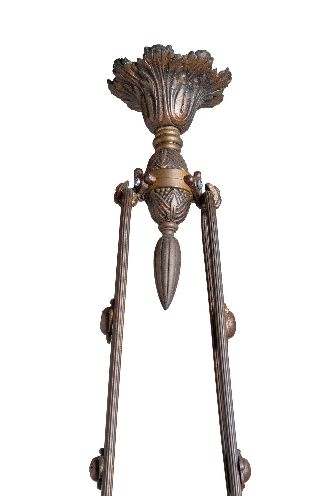 Een bruin messing armatuur met 4 glazen lampenkapjes.