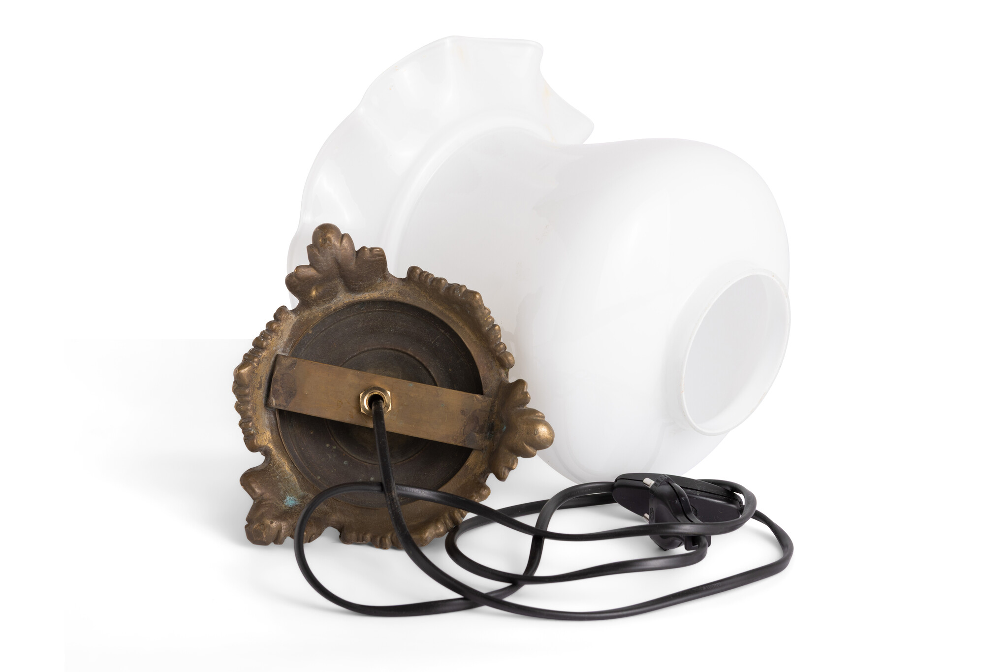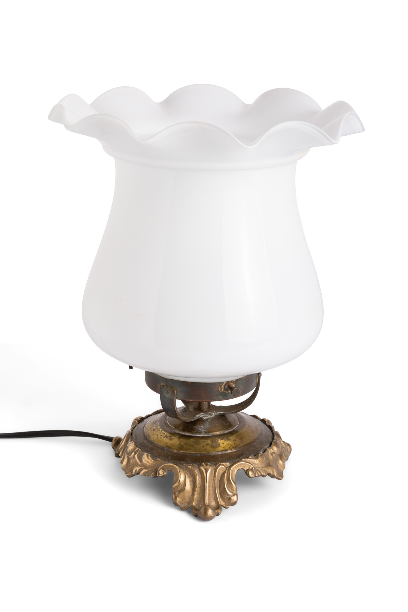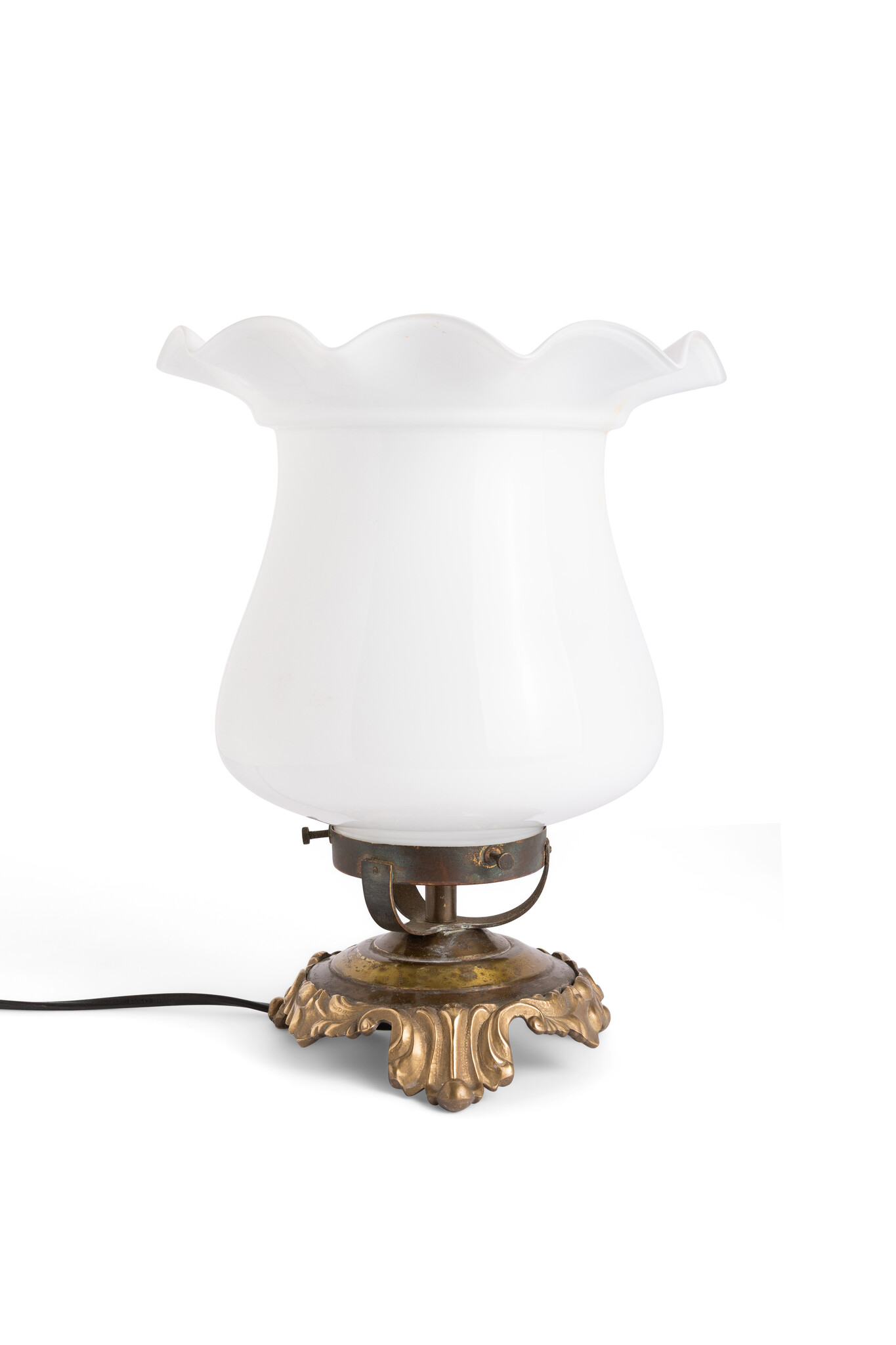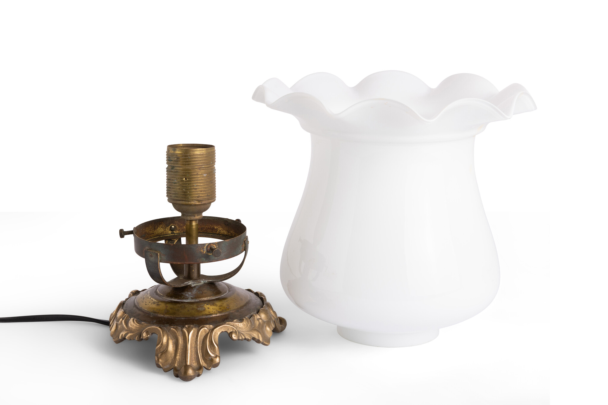 Een sierlijk opengewerkte voet met daarop een wit glazen lampglas.