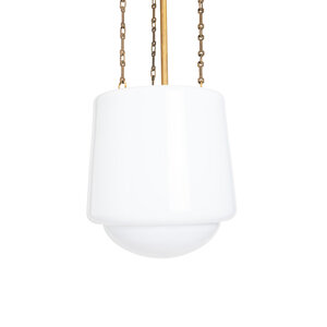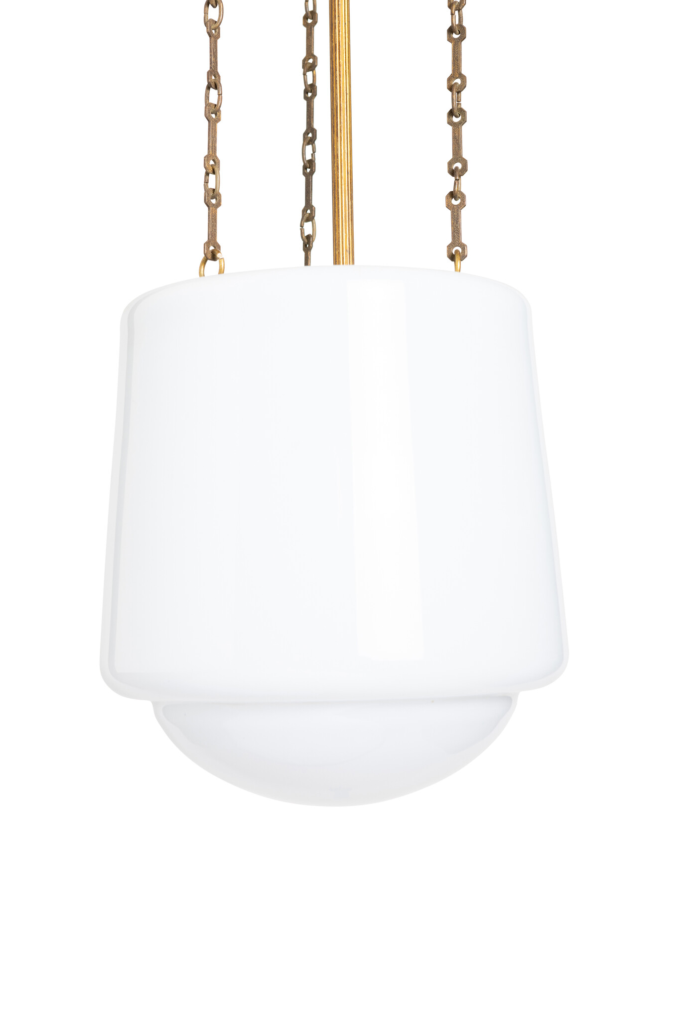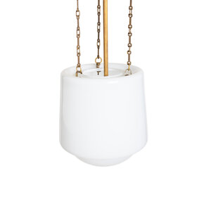 Een wit glazen lampenkap, dicht aan de onderzijde en heel strak van vorm.