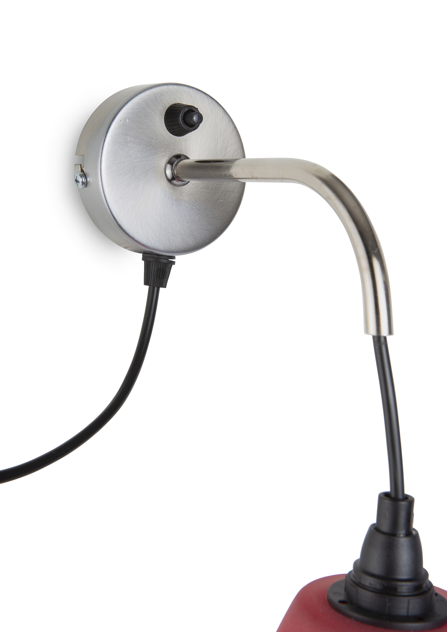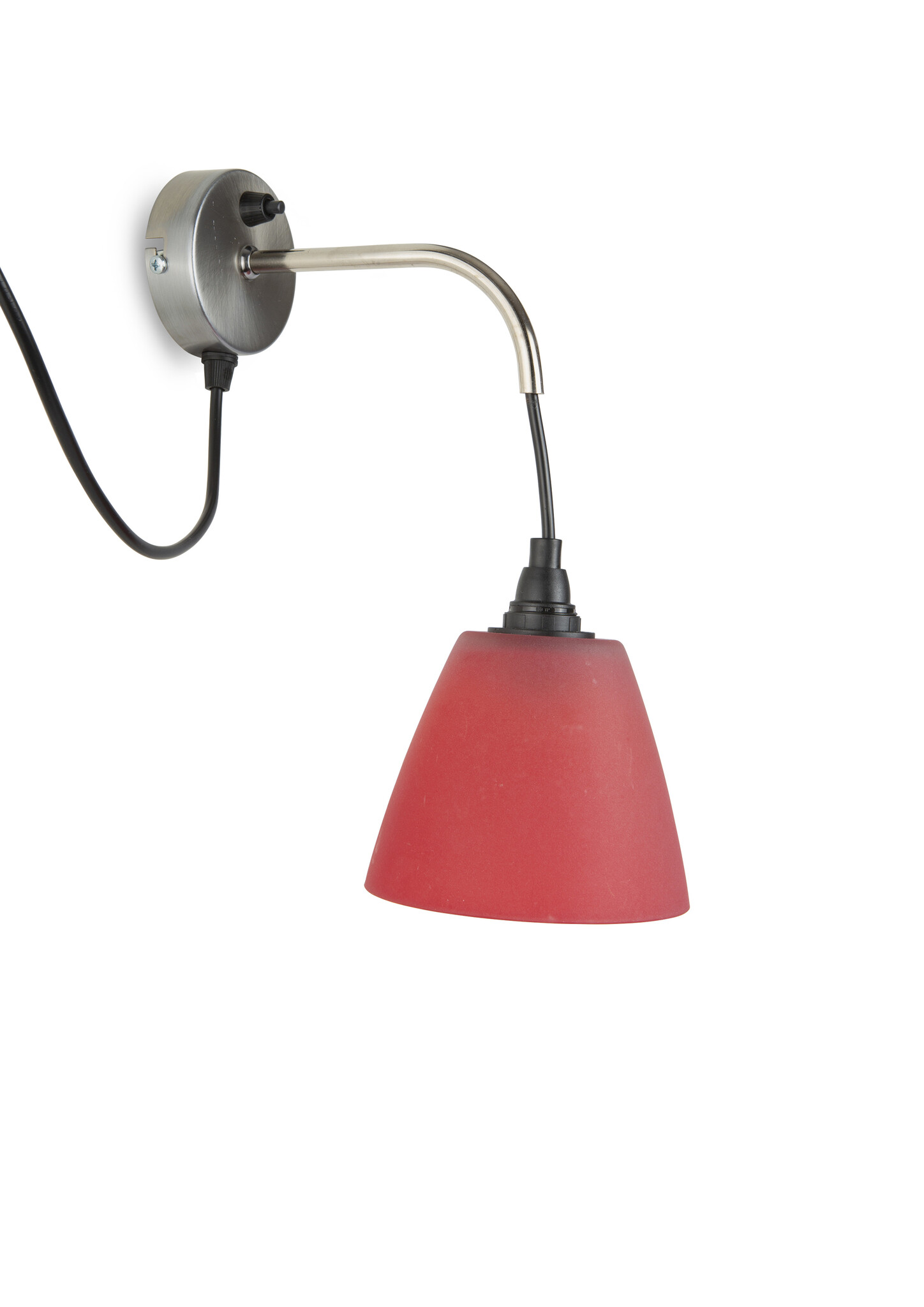 Een mat rood glazen lampenkapje en een mat en glimmend zilverkleurig armatuur.
