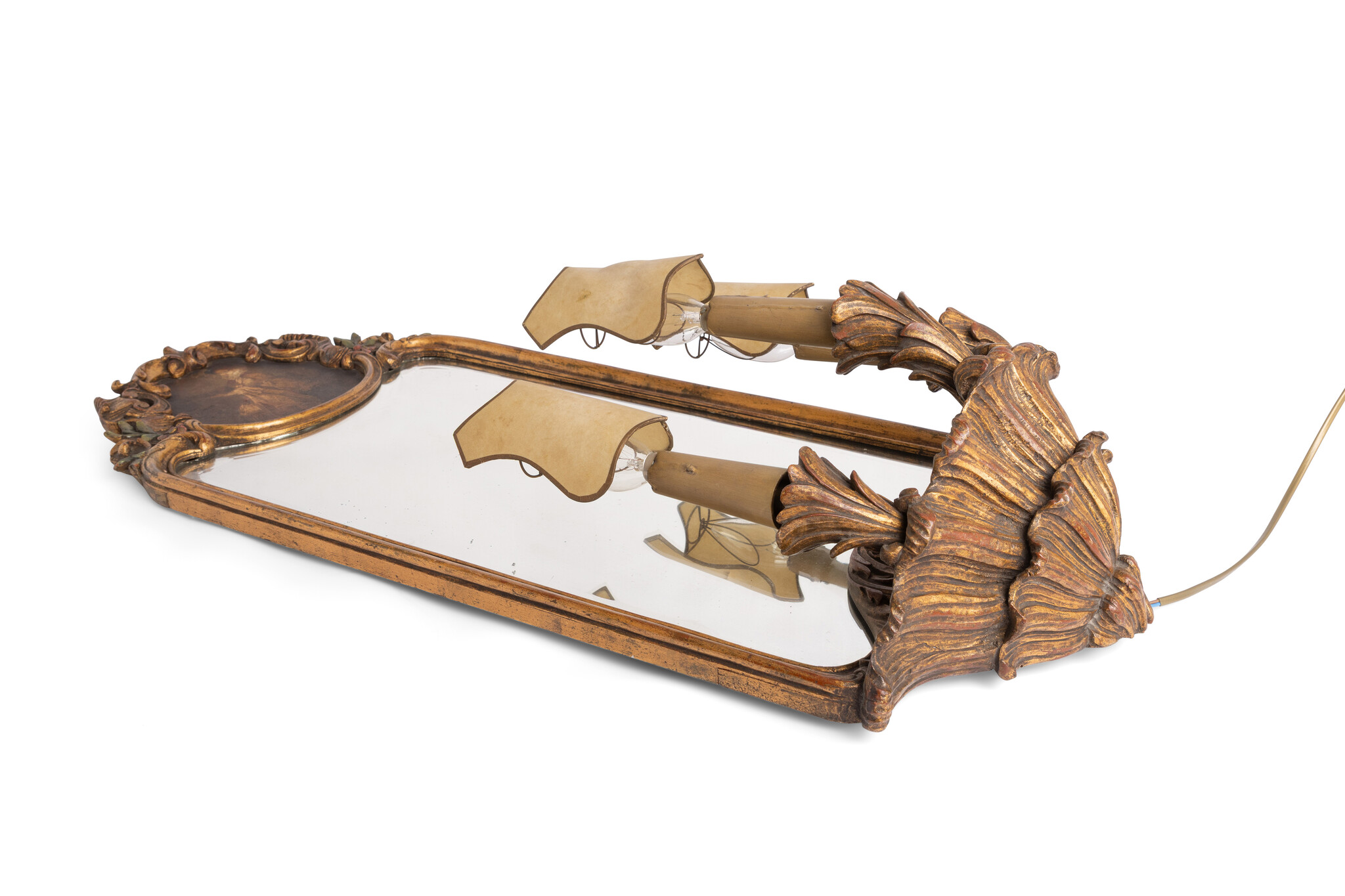 Dit is een vrij grote wandlamp met een houten en gipsen frame en een spiegel.