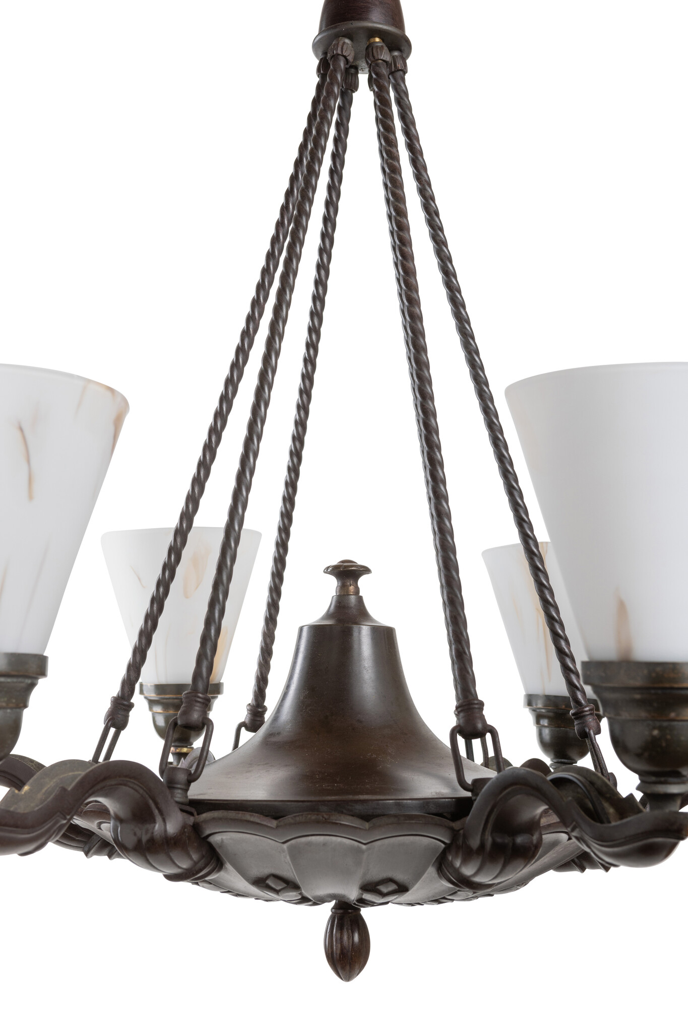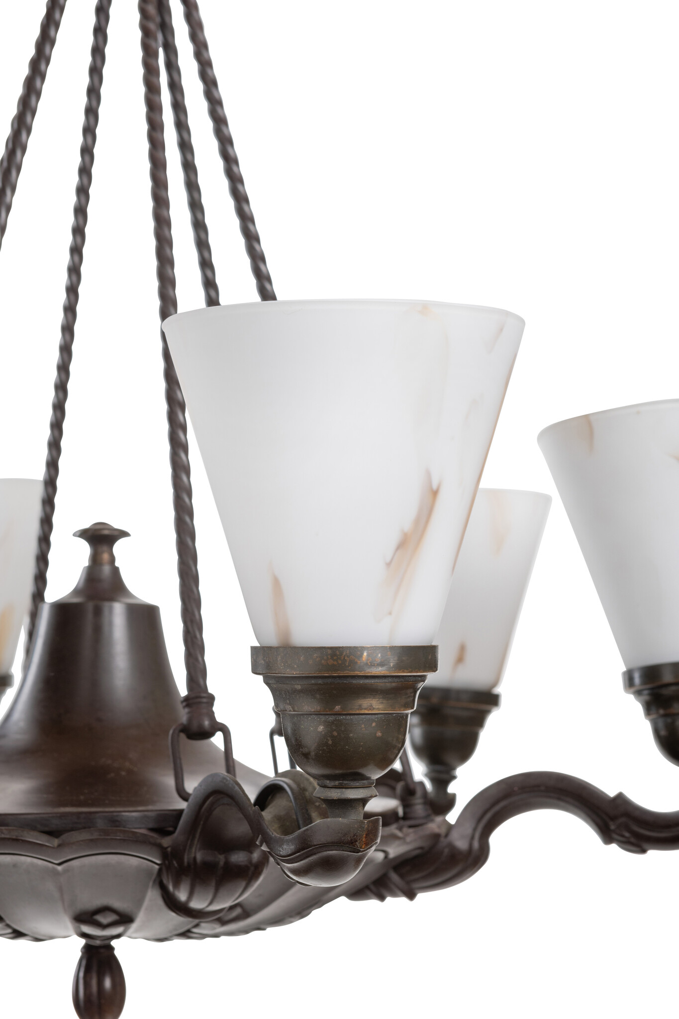 Een gebruineerd armatuur, 4 stangen die omhoog gaan en een zestal armen.