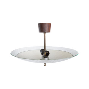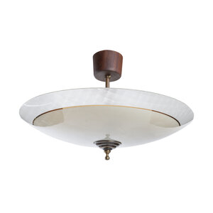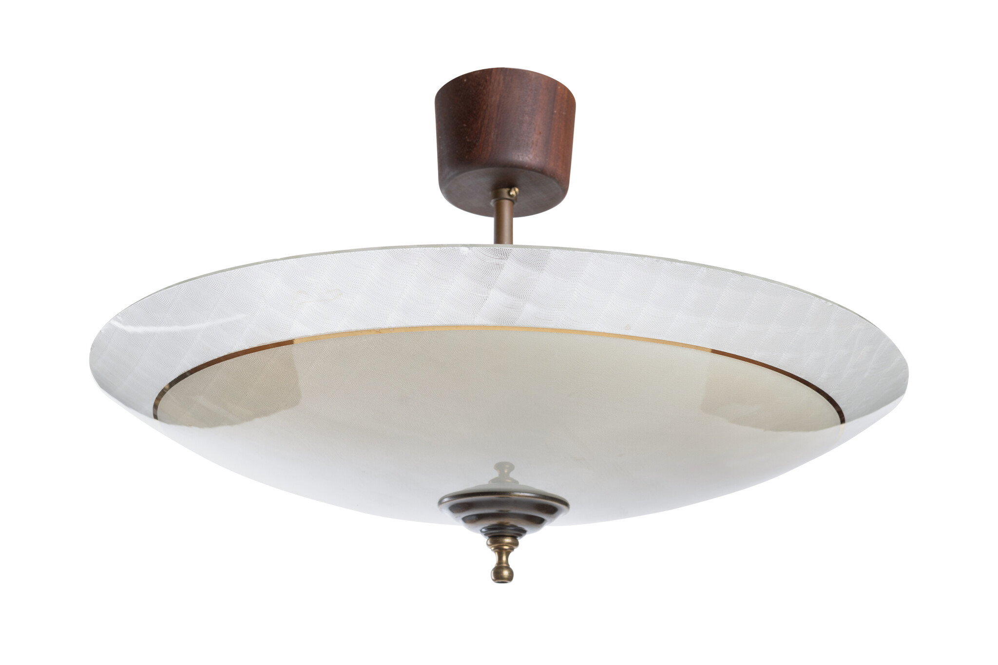 Een glazen schaal die vrij dicht bij het plafond hangt.