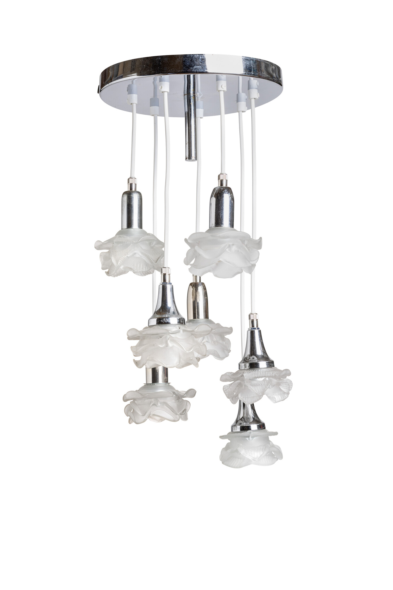 Oude hanglamp met zeven matglazen roosjes op diverse hoogtes.