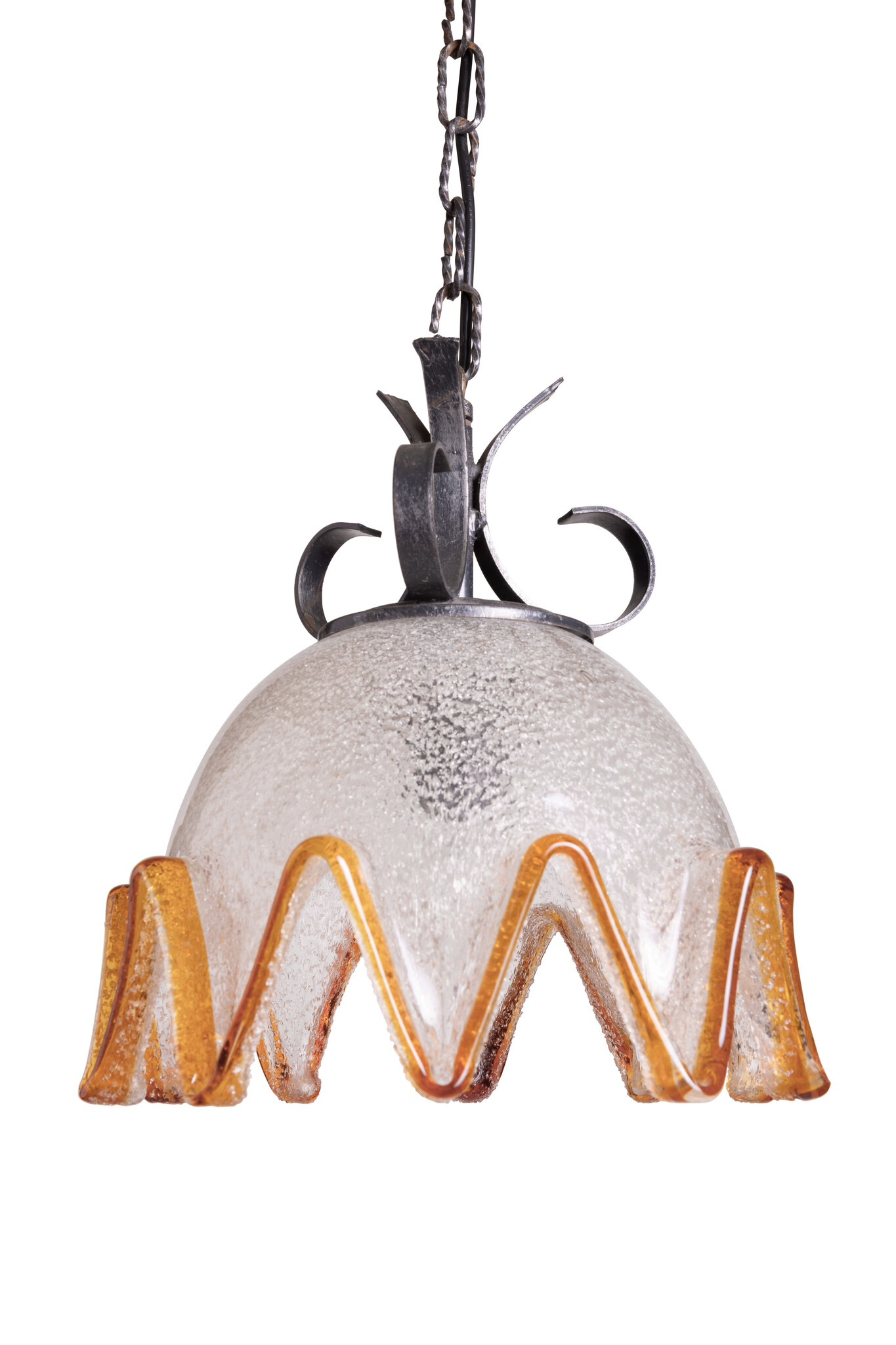 Een glazen kap met een bruin/oranje sierrand, in een soort kartel-vorm.