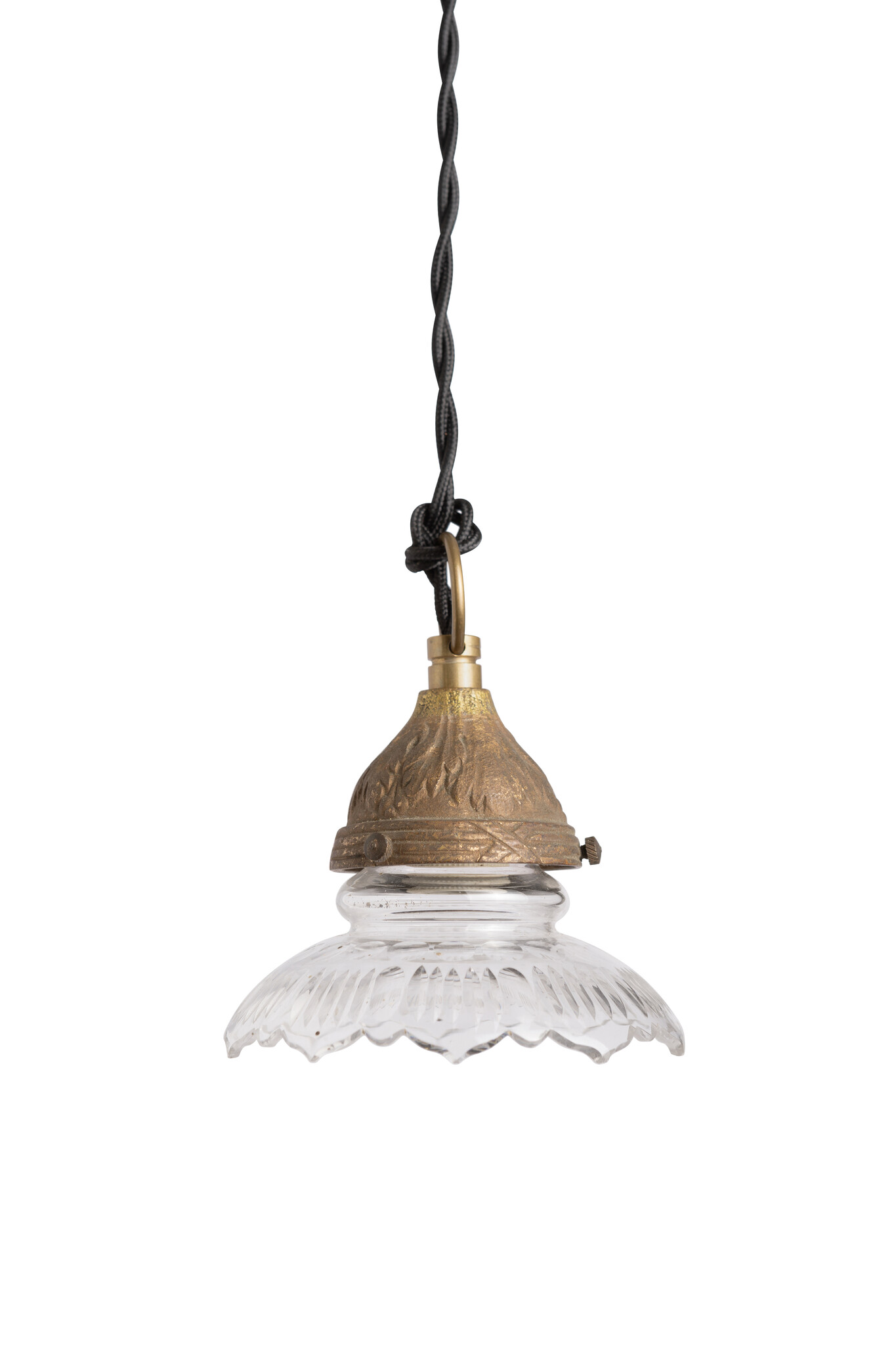 Een goud-bruin messing armatuur en een geslepen glazen kapje.