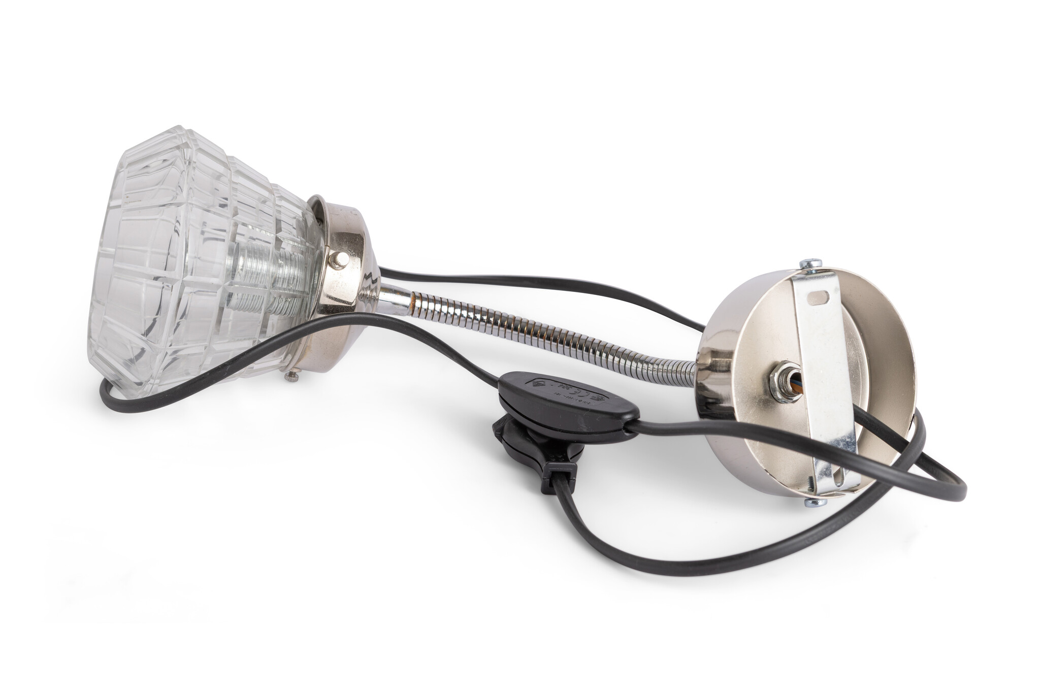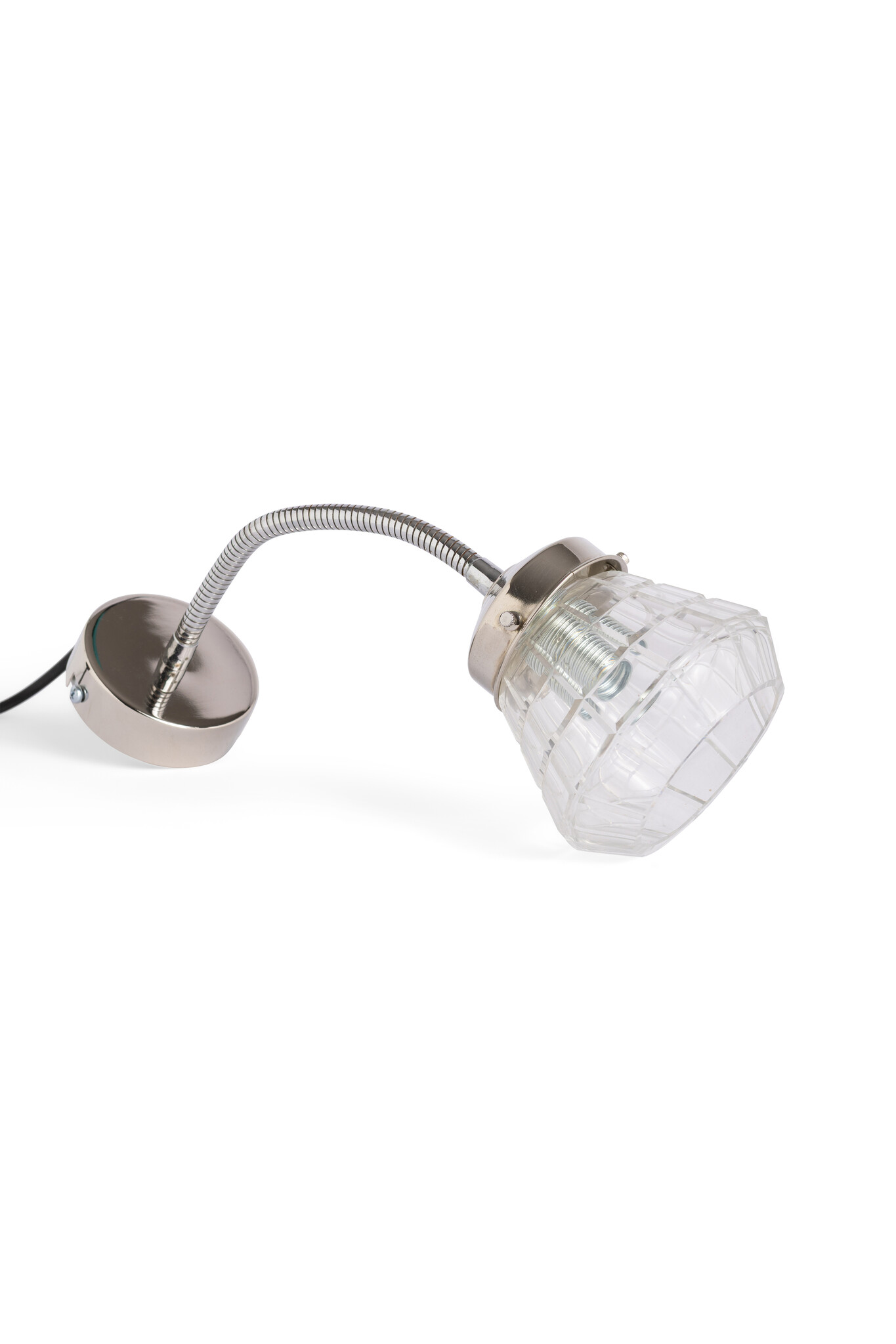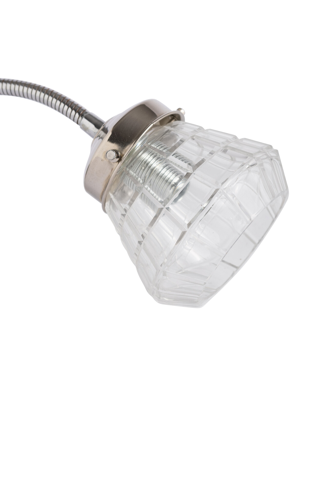 Op de buigarm een mooi hoekig helder glazen kapje.