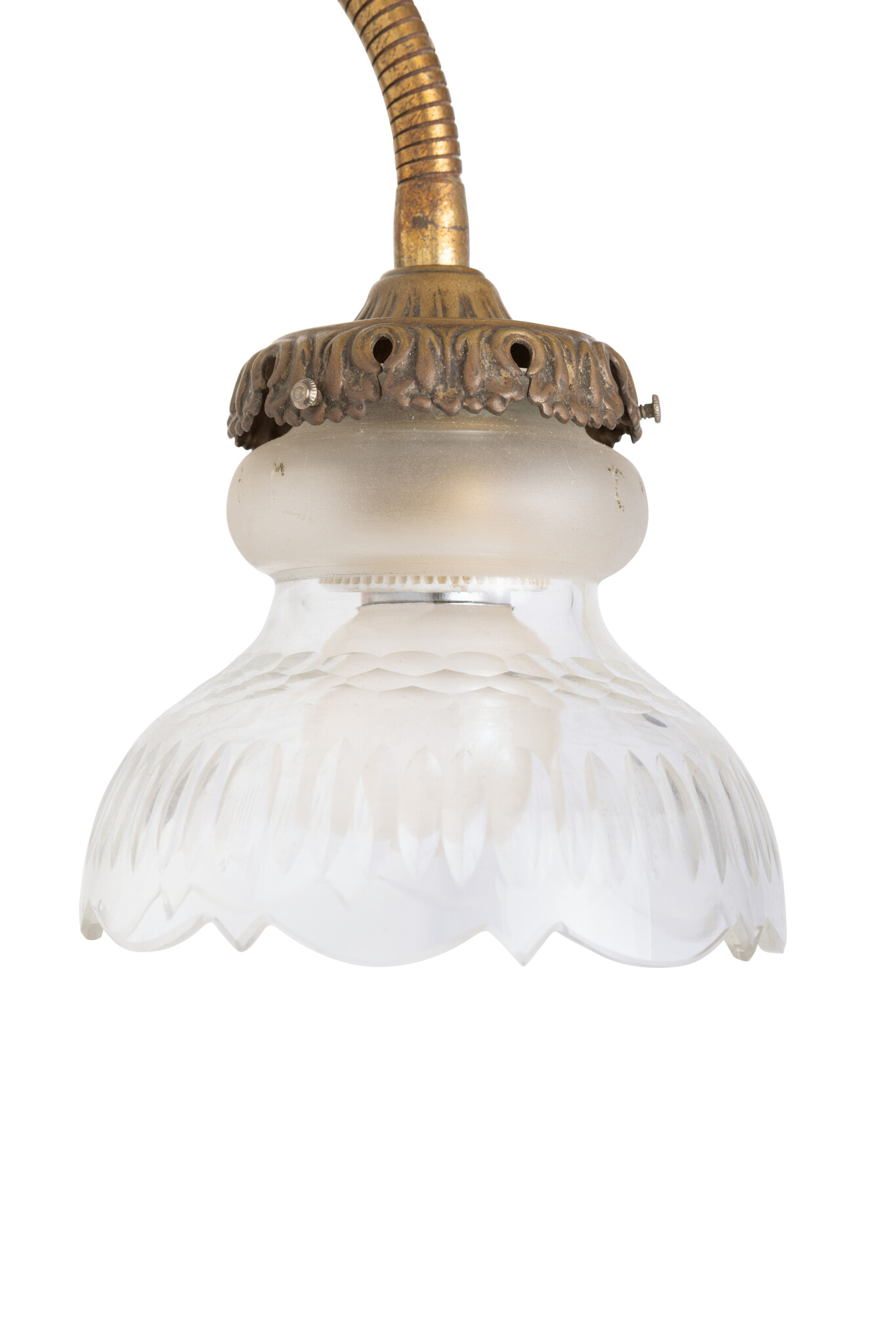 Een bruin en goudbruin messing armatuur met een sierlijk glazen lampenkapje.
