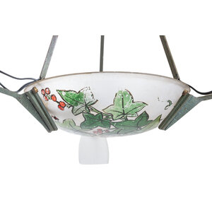 Een matglazen schaal met beschildering, groene bladeren en takjes met bessen.