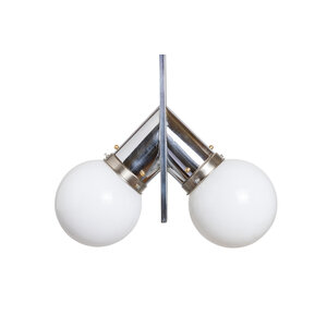 De hanglamp is 28.0 cm breed als je beide glazen bollen ziet.