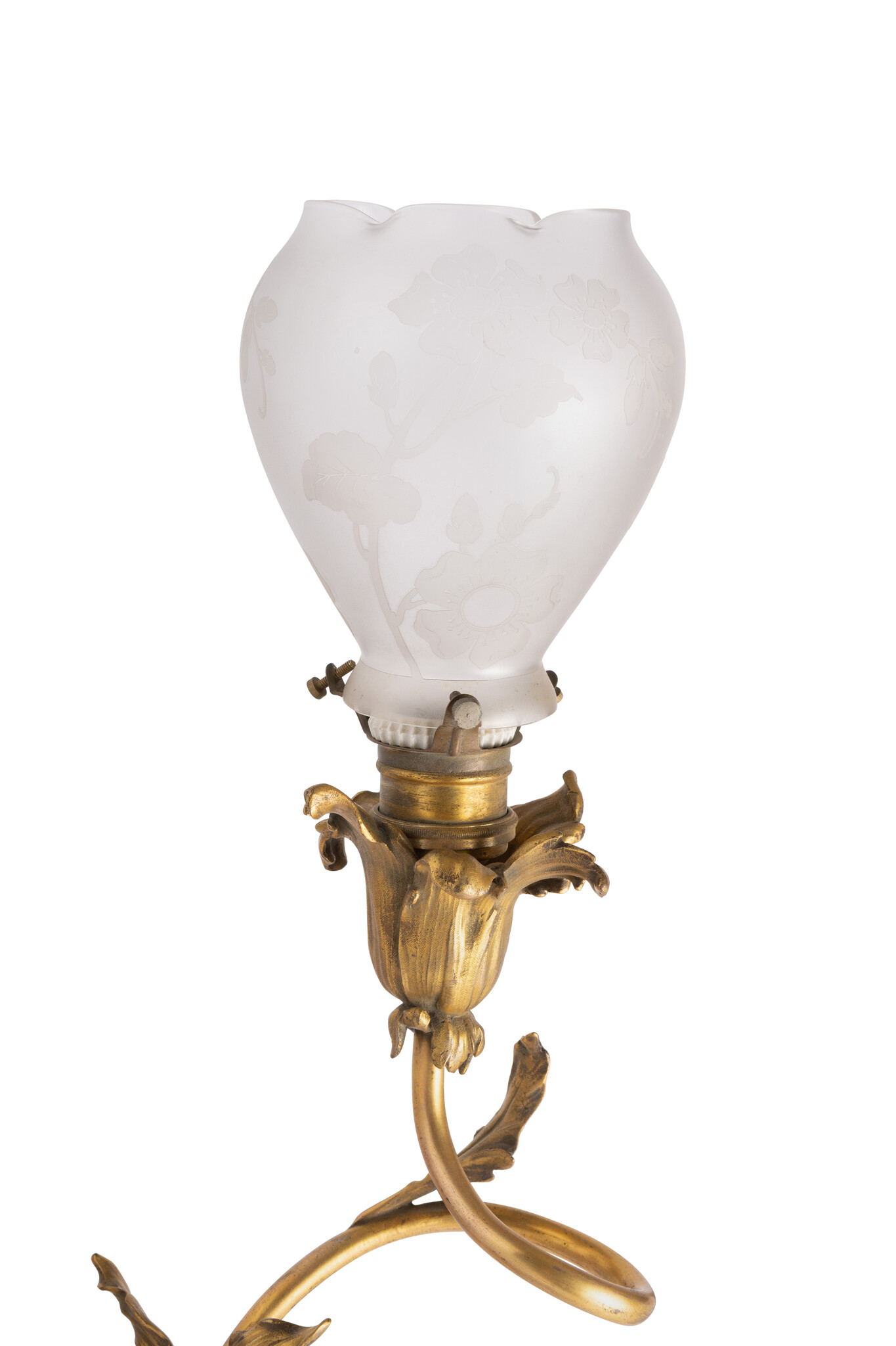 Een goudkleurig messing armatuur met twee matglazen lampenkapjes.